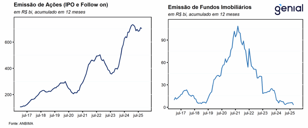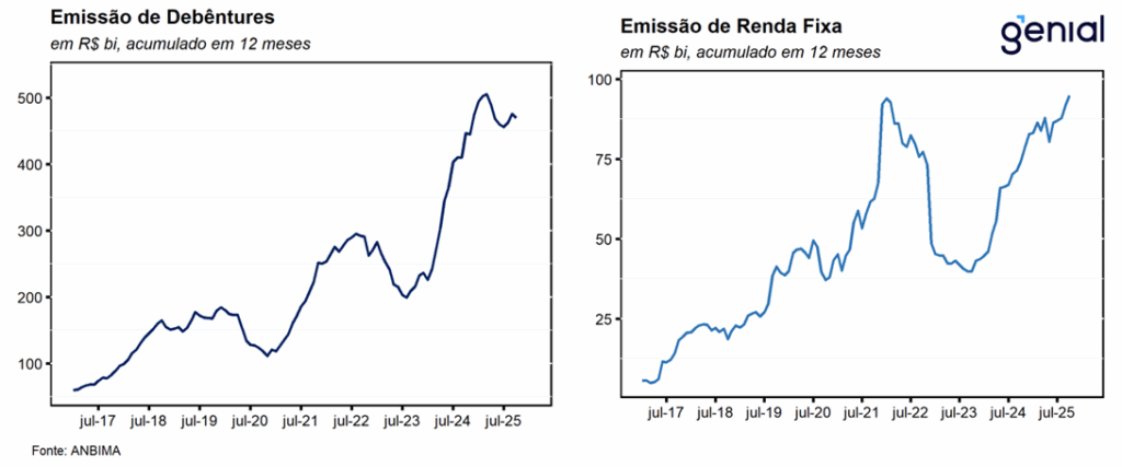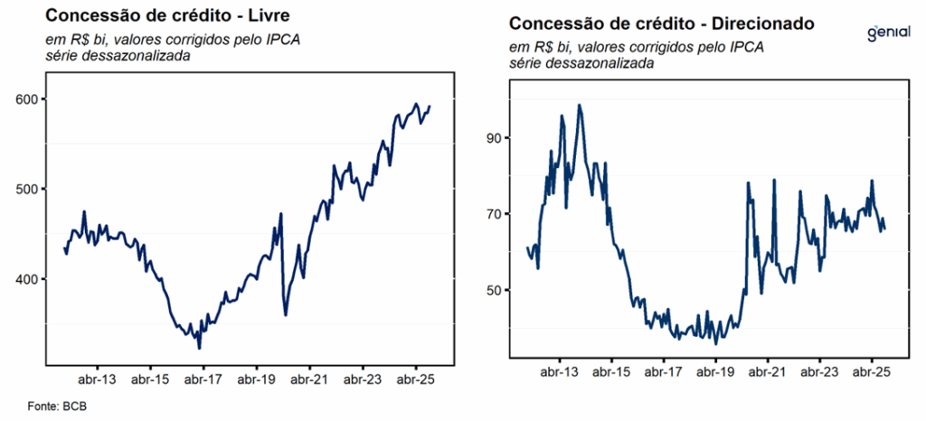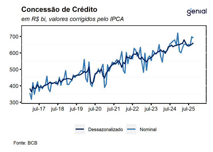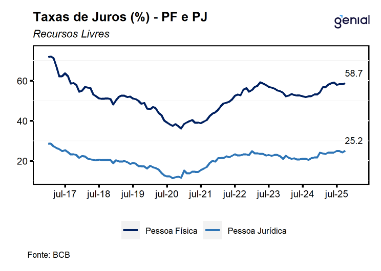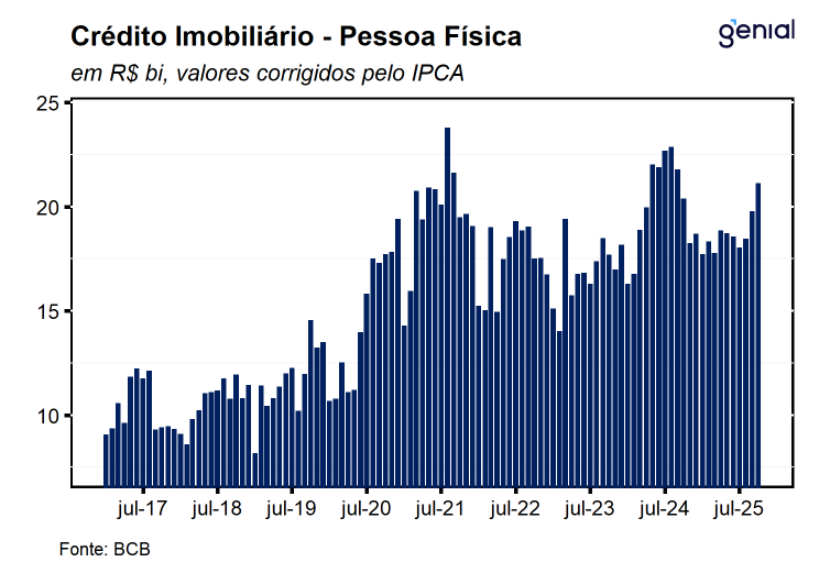 Para as pessoas físicas, as concessões livres, registraram expansão de 12,8% a/a em outubro, acelerando em relação aos 12,5% a/a registrados no mês imediatamente anterior. Os principais destaques, em termos reais, ficaram por conta dos desempenhos observados nas concessões de crédito consignado privado (+257,1% a/a), que vem se acelerando nos últimos meses, em linha com a entrada em vigor da MP 1292/25 do consignado privado para celetistas; crédito pessoal não consignado (10,1% a/a); e cartão de crédito (7,6% a/a), refletindo principalmente a alta de 29,4% a/a da modalidade parcelada, ao passo em que as modalidades à vista e do rotativo apresentaram altas de 6,6% a/a e 4,2% a/a, respectivamente. Na ponta negativa, as principais baixas ficaram por conta das concessões de crédito consignado para beneficiários do INSS (-33,6% a/a) e na modalidade outros (-14,4% a/a).