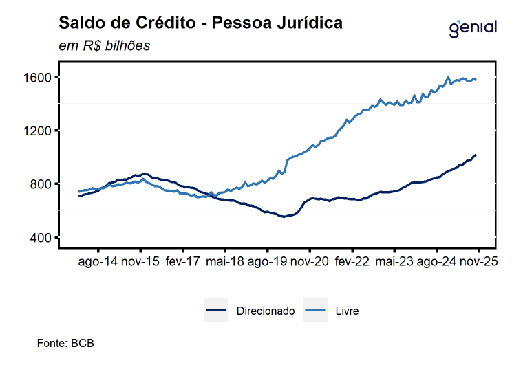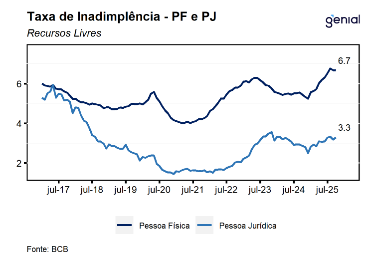 Em outubro, o saldo das operações de crédito registrou alta de 10,2% a/a, ficando estável em relação à leitura do mês imediatamente anterior, de modo que, o volume de crédito do Sistema Financeiro Nacional (SFN) avançou para R$ 6,91 tri (ante R$ 6,85 tri). Esse resultado é derivado da expansão de 11,3% a/a da carteira de pessoas físicas e de 8,4% a/a no saldo das pessoas jurídicas. Em relação às modalidades de crédito, houve alta de 8,8% a/a na carteira de crédito livre e de 12,2% a/a na carteira de crédito direcionado, com a primeira acelerando em relação à alta de 8,6% a/a, enquanto a segunda desacelerou dos 12,5% a/a registrados em setembro.