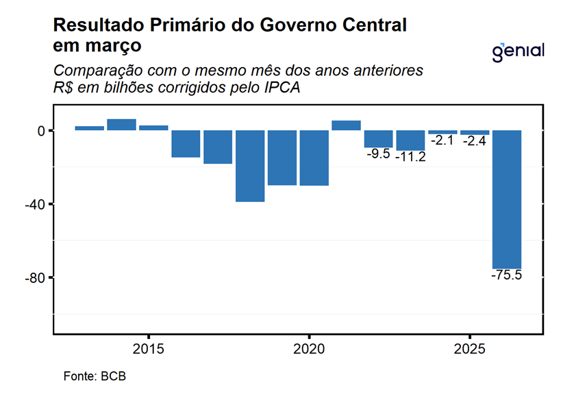 Com o resultado de março, no acumulado no ano, em termos reais, o governo central registrou um déficit primário de R$ 16,0 bi, frente a um superávit de R$ 58,8 bi no mesmo período do ano anterior, registrando uma piora de 127,2% a/a (-R$ 74,7 bi). Esse resultado foi reflexo da combinação entre a alta de 4,2% a/a na receita líquida (+R$ 25,3 bi) e o aumento de 18,3% a/a nas despesas totais (+R$ 100,1 bi). Pelo lado das receitas, os principais destaques ficaram por conta do avanço de 4,5% a/a das receitas administradas pela RFB (+RS 22,8 bi), em função do bom desempenho das rubricas mais ligadas ao ciclo econômico neste início de ano e da mudança da legislação de cobrança do IOF sem contrapartida no mesmo período do ano passado. Em contrapartida, houve recuo de 9,7% a/a nas receitas não administradas pela RFB (-R$ 7,7 bi), com destaque para a queda na arrecadação com a exploração de recursos naturais devido à cotação mais baixa do petróleo em relação ao primeiro trimestre de 2025 e na arrecadação com dividendos e participações. Pelas despesas, o avanço teve como destaque a alta nos desembolsos com o pagamento de precatórios, cujo descasamento no calendário de pagamentos em relação ao ano passado promoveu um forte aumento das despesas ao longo dos três primeiros meses de 2026 em comparação ao mesmo período de 2025. Em contrapartida, houve redução nos gastos com o programa Bolsa Família (-9,3% a/a ou -R$ 4,0 bi).