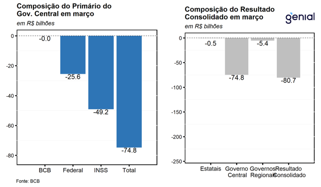 O setor público consolidado (governo central, governos regionais e empresas estatais) apresentou déficit primário de R$ 80,7 bi em março, vindo pior do que o esperado pelo teto das expectativas de mercado de déficit de R$ 75,4 bi (Broadcast+) e do que a nossa expectativa para o mês de déficit de R$ 75,5 bi. O resultado consolidado no mês foi reflexo da combinação entre os déficits de R$ 74,8 bi; R$ 5,4 bi; e de R$ 500,0 mi do governo central, entes subnacionais e empresas estatais, respectivamente. O principal desvio em relação à nossa projeção para o mês foi derivado do elevado déficit registrado no desempenho dos entes subnacionais que surpreendeu a nossa expectativa de resultado próximo ao neutro no mês.