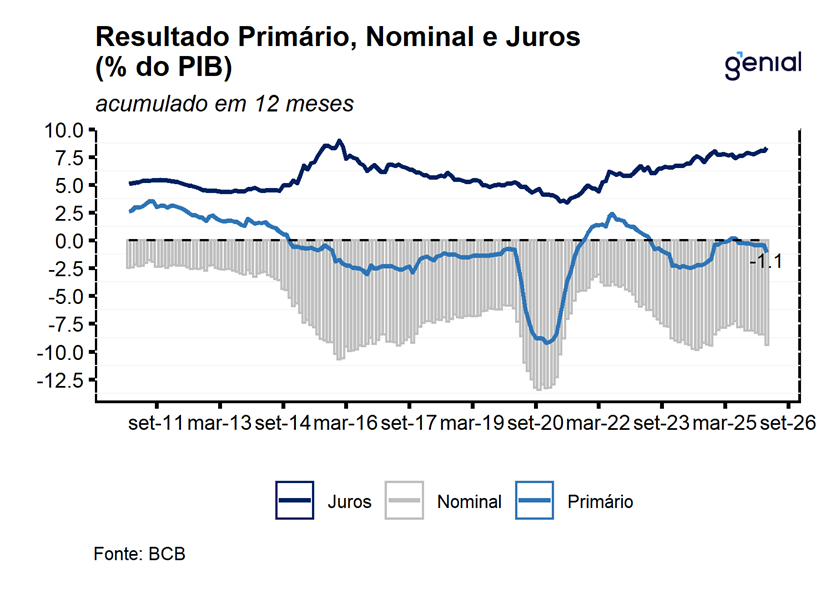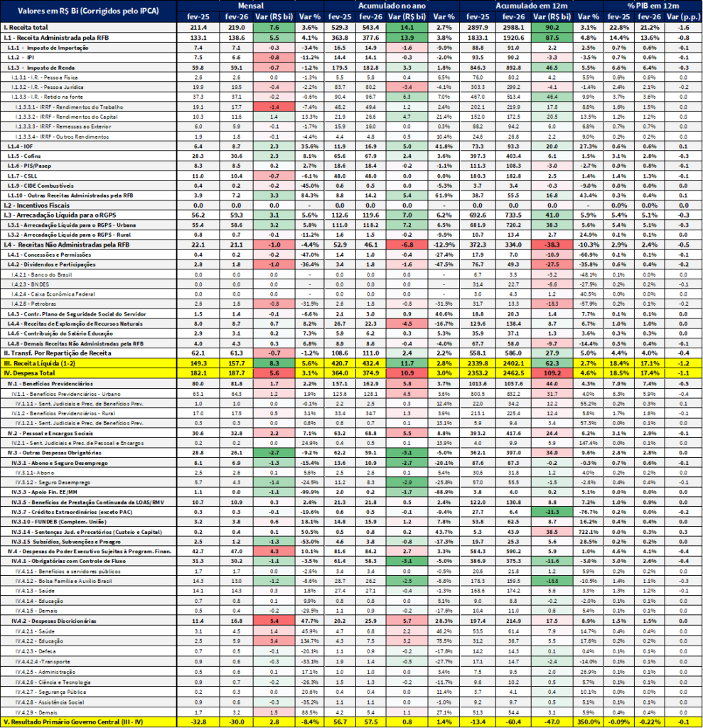 O resultado nominal do setor público consolidado, que inclui o resultado primário e os juros nominais apropriados, foi deficitário em R$ 199,5 bi em março, ante déficit de R$ 107,7 bi em fev/26 e de déficit de R$ 71,6 bi no mesmo mês do ano anterior. No acumulado em 12 meses, o déficit nominal alcançou R$ 1.217,5 bi (9,41% do PIB), ante déficit de R$ 948,5 bi (7,88% do PIB) no mesmo mês do ano anterior.