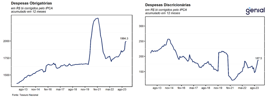 Pelo lado das receitas líquidas, em termos reais, o bom desempenho em relação ao mesmo período do ano anterior (+7,5% a/a ou +R$ 13,7 bi), foi derivado da combinação entre a alta de 8,7% a/a da receita administrada pela RFB (+R$ 8,7 bi), do aumento de 5,9% a/a da arrecadação líquida para o RGPS (+R$ 3,3 bi) e o recuo de 3,1% a/a das receitas não administradas pela RFB (-R$ 785,1 mi). Em relação ao primeiro grupo, o bom desempenho no mês foi reflexo principalmente das altas de 49,7% a/a (+R$ 2,8 bi) e 32,7% a/a (+R$ 2,3 bi) na arrecadação com o IOF e com o imposto de importação, refletindo o aumento das alíquotas de ambos os tributos em relação ao mesmo período do ano passado. Além disso, também pode-se destacar o avanço de 3,6% a/a na arrecadação com o imposto de renda (+R$ 2,3 bi), principalmente em função do avanço de 14,9% a/a na arrecadação do IRPJ (+R$ 2,9 bi), e de 12,3% a/a na arrecadação com a CSLL (+R$ 1,4 bi), com ambos os crescimentos refletindo o aumento no lucro presumido. Por fim, tivemos um avanço de 4,8% a/a (+R$ 1,5 bi) na arrecadação com a Cofins, tendo como destaque a arrecadação no setor de serviços. Em relação às receitas não administradas, o destaque ficou por conta da queda de -35,4% a/a (-R$ 1,8 bi) na arrecadação proveniente de dividendos e participações, refletindo um pagamento de dividendos por parte do Banco do Brasil cerca de R$ 1,1 bi a menos do que no mesmo período do ano passado.