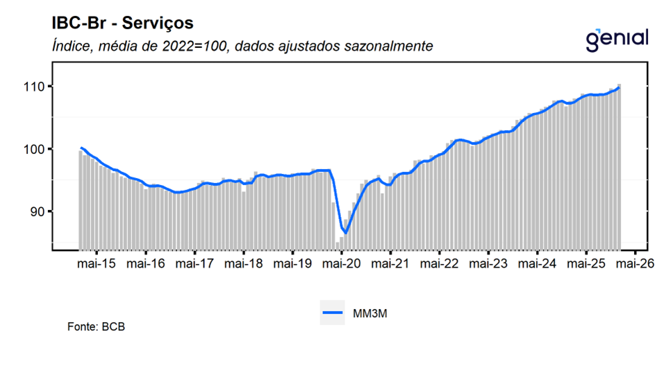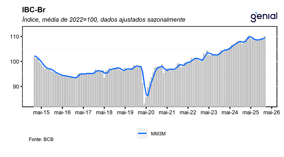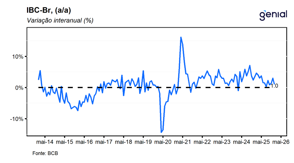 Houve revisões nos dados dos meses anteriores. O IBC-Br de outubro saiu de 0,05% m/m para 0,09% m/m, o de novembro de 0,59% m/m para 0,60% m/m e o de dezembro de -0,18% m/m para -0,15% m/m. Com o resultado de janeiro e as revisões na série histórica, o IBC-Br deixa um carrego estatístico de 0,88% para o primeiro trimestre de 2026 e de 0,93% para o ano cheio.