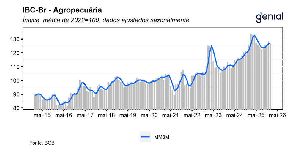 Em janeiro, o desempenho positivo do IBC-Br foi decorrente da combinação entre o recuo de 1,49% m/m da agropecuária, que foi mais do que compensada pelos avanços de 0,37% m/m da indústria e de 0,81% m/m dos serviços. Cabe destacar que com este resultado o setor de serviços reverte a queda de 0,12% m/m observada no final do ano passado, de modo que, seu indicador atingiu o nível mais elevado já registrado em sua série histórica. Com estes resultados, o índice IBC-Br ex-agro registrou alta de 0,86% m/m, revertendo o recuo de -0,27% m/m de dez/25 e, assim como o setor de serviços, alcançou o nível mais elevado já registrado em sua série histórica. Com isso, a sua média móvel trimestral saiu de 0,1% para 0,4% neste início de ano, corroborando a nossa expectativa de reaceleração da atividade econômica no 1T26.