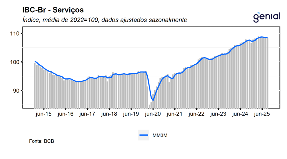 Os dados divulgados hoje pelo Banco Central estão amplamente alinhados às leituras setoriais mais recentes do IBGE — indústria, serviços e varejo — que, em sua maioria, apontaram retração da atividade em setembro, reforçando nossa expectativa de um arrefecimento gradual da economia. Para os próximos meses, seguimos avaliando que a política monetária contracionista continuará afetando de forma mais intensa os setores sensíveis ao crédito, enquanto segmentos diretamente ligados à renda devem manter maior resiliência, sustentados por uma política fiscal ainda expansionista e por um mercado de trabalho aquecido. Ainda assim, diante dos elevados níveis de endividamento das famílias e do aumento do comprometimento da renda com o serviço da dívida, entendemos que o impulso positivo oriundo da renda e da política fiscal tende a perder força. Esse quadro deve contribuir para uma desaceleração do consumo ao longo dos próximos trimestres, embora em ritmo gradual, compatível com o cenário de moderação da atividade que projetamos.