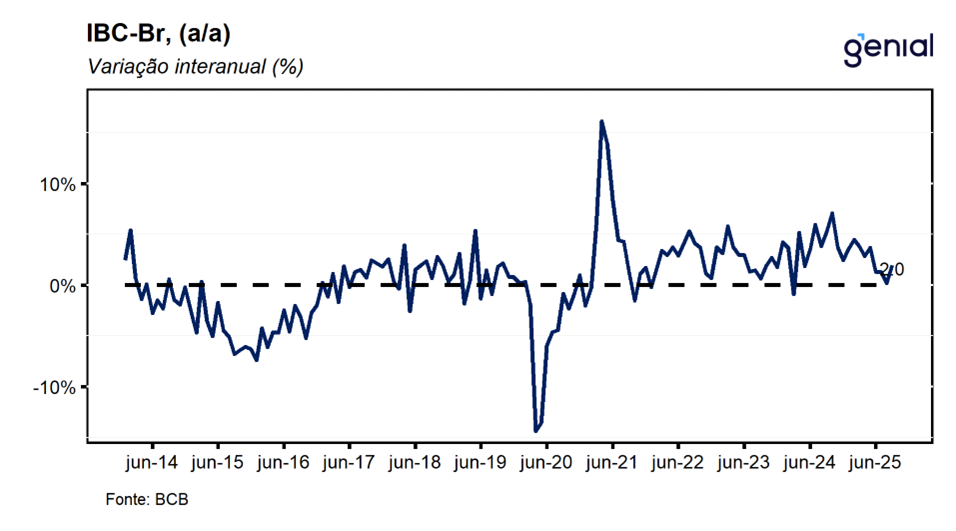 Em setembro, o IBC-Br (índice de Atividade Econômica do Banco Central) registrou recuo de 0,24% m/m na comparação mensal, vindo pior do que o esperado tanto pelo consenso de mercado (-0,1% m/m, Broadcast+) quanto por nós (-0,09% m/m). O resultado reverte parte da alta de 0,39% m/m registrada em agosto, mês em que havia sido interrompida uma sequência de três quedas consecutivas. Diferentemente do observado no mês anterior, a contração de setembro foi disseminada entre os principais segmentos da atividade, com exceção da agropecuária, que avançou após diversas leituras negativas desde o primeiro trimestre. Na nossa avaliação, o dado reforça o diagnóstico de que a economia segue em trajetória de desaceleração gradual ao longo dos próximos trimestres, refletindo o ambiente macroeconômico mais adverso e, sobretudo, os efeitos defasados da política monetária contracionista sobre os setores mais sensíveis ao crédito. Na comparação interanual, o IBC-Br avançou 2,0% a/a, resultado alinhado ao consenso, ainda que levemente abaixo da nossa projeção (2,14% a/a).