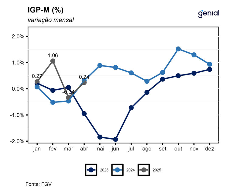 O IGP-M de abril registrou alta de 0,24% m/m, forte avanço em relação ao recuo de 0,34% m/m em março e substancialmente acima do teto das expectativas do mercado (0,05% m/m, Broadcast+). A leitura de abril está alinhada com o último IPCA-15, sugerindo que, nos próximos meses, os alimentos e bens industriais devem seguir exercendo pressão inflacionária, ambos apontando para um cenário qualitativo ainda desafiador. No acumulado de 12 meses, o índice registra variação de 8,50%.