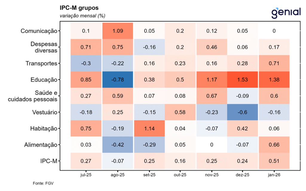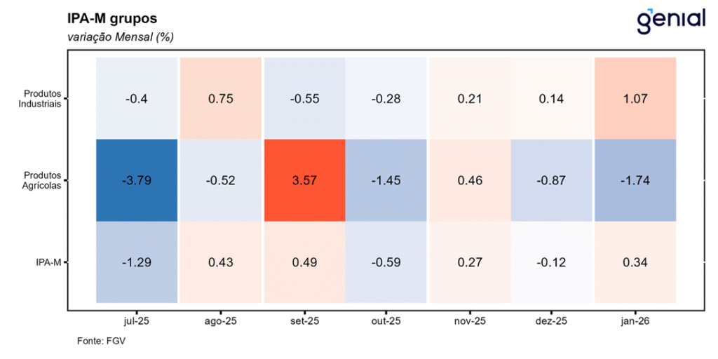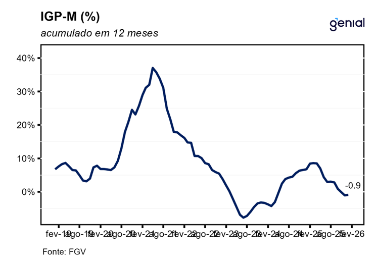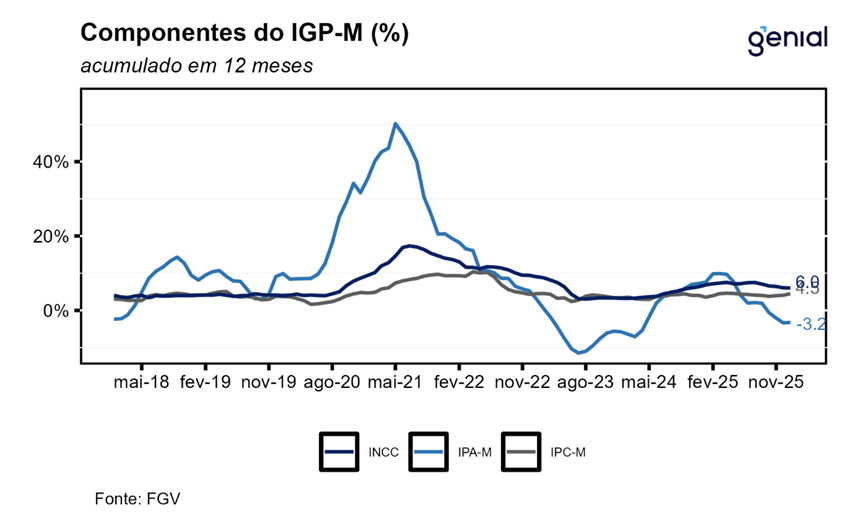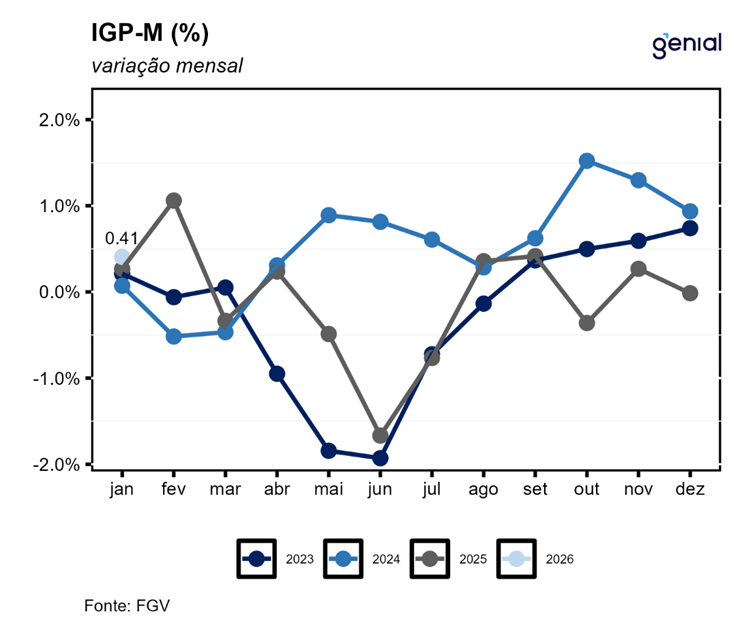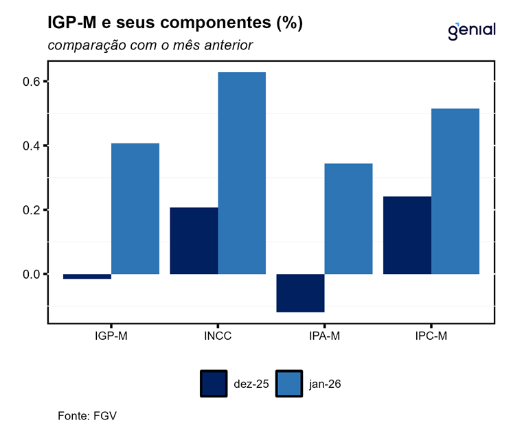 Em janeiro, o IGP-M (Índice Geral de Preços – Mercado) registrou avanço de 0,41% na comparação mensal, invertendo a queda dezembro de 0,01% e ficando próximo da nossa projeção de 0,39% m/m e da expectativa de mercado (0,42% m/m, Broadcast+). Na comparação interanual 12 meses o índice acumula queda de 0,91%. As principais contribuições para alta do mês vieram de produtos industriais no IPA, cursos no IPC e mão de obra no INCC. Apesar do qualitativo um pouco pior vindo do último grupo, o quantitativo ainda é positivo, vindo ligeiramente abaixo da mediana histórica do indicador. Principal driver desse direcional segue sendo o IPA-M, reflexo de uma taxa de câmbio estruturalmente mais apreciada no último semestre de 2025 e, agora, começo de 2026.