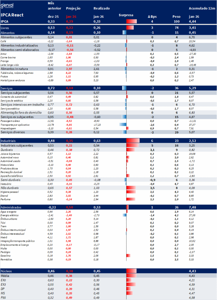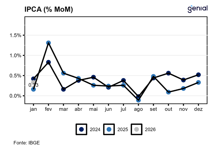 Em janeiro, o IPCA registrou variação de 0,33% m/m, acima da nossa expectativa de 0,29% m/m e próximo da expectativa de mercado (0,32% m/m, Broadcast+). Com esse resultado o índice acumula alta de 4,44% nos últimos 12 meses. Apesar da surpresa altista a composição do mês veio mais próxima da nossa projeção, com alimentação e serviços mais baixos e administrados avançando de forma mais intensa, com boa parte da surpresa vindo de itens voláteis. Ainda assim, o qualitativo é um pouco pior do que o antecipado, com bens industriais se deteriorando, mas serviços melhorando em itens importantes na margem. Núcleos corroboram a análise, com piora em todos exceto o P55, que confirma piora, mas com distribuição ainda bem enquadrada. Em nossa avaliação, o IPCA de janeiro não traz viés para cima nem para baixo para o ciclo de corte de juros, com leitura reforçando a necessidade de serenidade e cautela no processo, corroborando nossa expectativa de -50 bps para a reunião de março, talvez tirando um pouco da probabilidade de -75 bps e jogando para -25 bps.