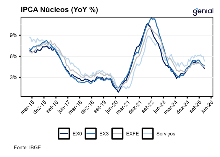 Nos serviços, a alta registrada foi de 0,10% m/m, enquanto nossa projeção era de 0,14% m/m. Toda surpresa está concentrada em transporte por aplicativo, item do grupo ex-subjacentes que caiu -17,23% m/m enquanto nossa expectativa era -9,85% m/m. O evento reflete a devolvida da alta de +14% m/m em dezembro, que ocorreu em menor magnitude nos anos anteriores. Subjacentes vieram em linha com projetado, e intensivos em trabalho ficaram mais baixo, puxados por serviços de estética. Esse último torna o qualitativo dos serviços um pouco melhor do que o antecipado, com erro de projeção suficientemente pronunciado para ser informativo. Apesar disso, acumulado em doze meses dos intensivos em trabalho é de 6,70%, refletindo o contexto atual de aquecimento do mercado de trabalho.