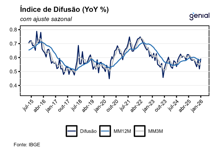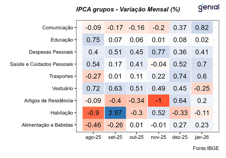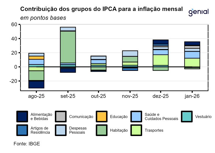 Bens industriais registraram alta de 0,63% m/m, substancialmente acima da nossa expectativa de 0,35% m/m. No padrão sazonal, a mediana para o grupo em janeiro é em torno de 0,27% m/m, e a leitura atual está no percentil 85º. O qualitativo do grupo é negativo, mas não tanto quanto o headline sugere. No lado ruim, dos +6 bps de surpresa altista de impacto no headline geral, +3 bps vieram dos bens duráveis. No subgrupo, pressão disseminada ao longo dos itens, e especialmente concentrada em itens inerciais como automóveis, configurando um qualitativo pior e que deve subir as projeções para os próximos meses. No lado neutro, a outra metade da surpresa altista (+3 bps) veio de perfume, item de natureza volátil, difícil previsão e com pouca conexão com os fundamentos econômicos. Nesse contexto, sem a contribuição de perfume, o IPCA de janeiro teria sido de 0,30% m/m, próximo da nossa expectativa de 0,29% m/m.