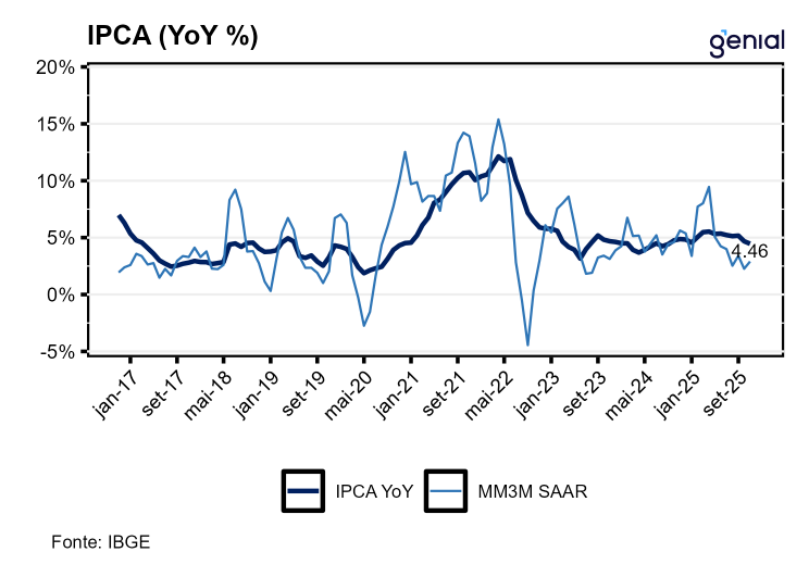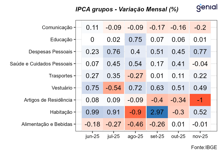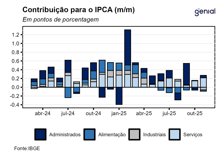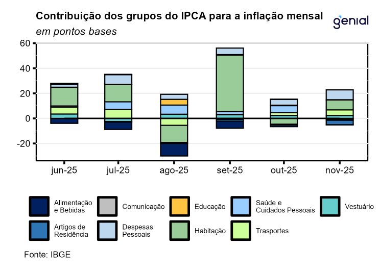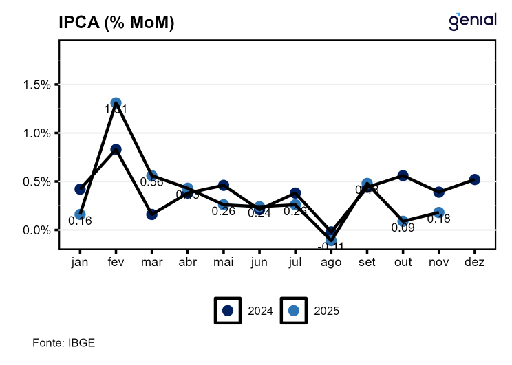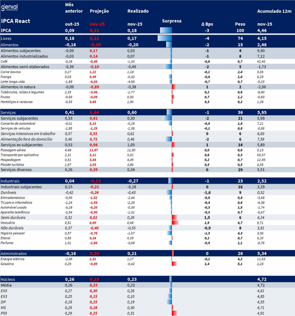 O IPCA de novembro registrou variação de 0,18% m/m, abaixo da nossa estimativa de 0,21% m/m e em linha com a expectativa de mercado (Broadcast+). Tanto o quantitativo quanto o qualitativo vieram melhor do que o esperado por nossa projeção, com viés de baixa em alimentação e bens se materializando, enquanto o viés de alta nos serviços não. Em nossa avaliação, o destaque foi que os itens pressionados nos serviços do IPCA-15 viraram em direção aos itens não pressionados, e não o contrário. Isso sugere que o efeito dos precatórios distribuídos em agosto parece estar sendo compensado pelos efeitos contracionistas da política monetária, o que deveria, teoricamente, ser refletido em PMS de outubro / novembro um pouco mais fracas. Núcleos trazem a mesma mensagem, com média subindo 0,23% m/m enquanto o esperado era de 0,25% m/m, melhor na margem.