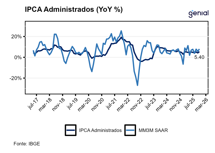 Itens administrados registraram aumento de 0,21% m/m, próximo da nossa projeção de 0,20% m/m. Energia elétrica veio em linha com a expectativa, com viés de baixa não realizado, mas o viés de alta na gasolina foi materializado. Novembro seria o principal mês de incidência do corte da Petrobrás, e as projeções iniciais de impacto seria de queda de -1,0% m/m no item, enquanto o realizado no mês foi -0,42% m/m. O mesmo direcional ocorreu em etanol, com variação um pouco acima do projetado.