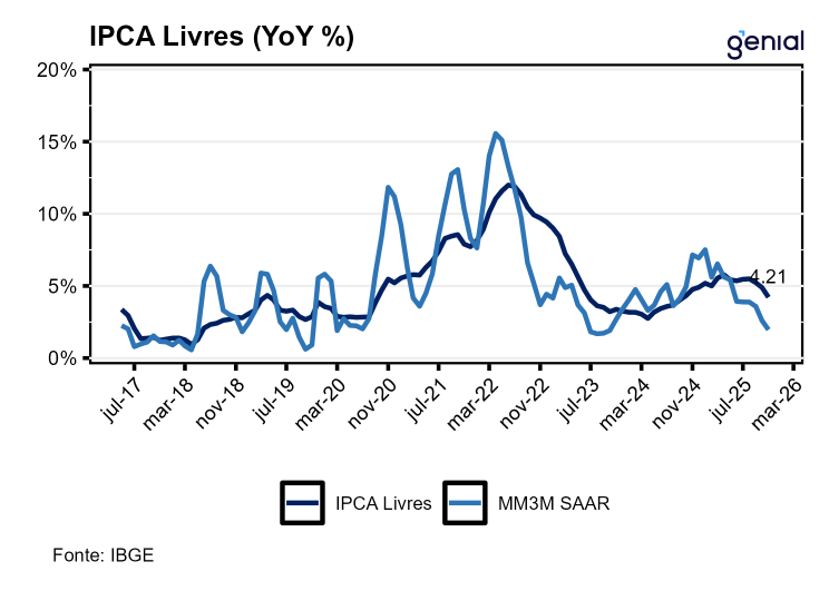 Alimentação no domicílio registrou queda de -0,20% m/m, abaixo da nossa expectativa de -0,09% m/m. O principal driver foram os semi-elaborados, puxados por frango e leite, onde a surpresa baixista no primeiro foi bem significativa. Esse movimento foi compensado em parte por alimentos in-natura um pouco mais elevados. O viés baixista para o grupo sinalizado no preview foi materializado, potencialmente trazendo revisões baixistas para os próximos meses e corroborando IPCA de dezembro mais baixo.