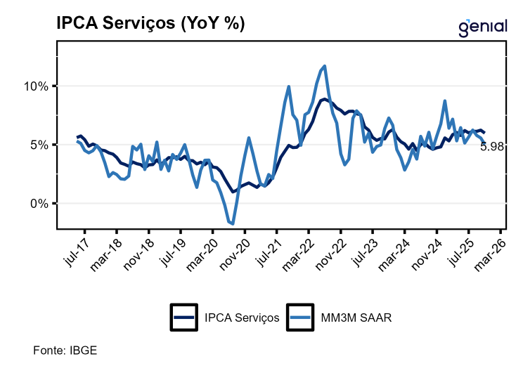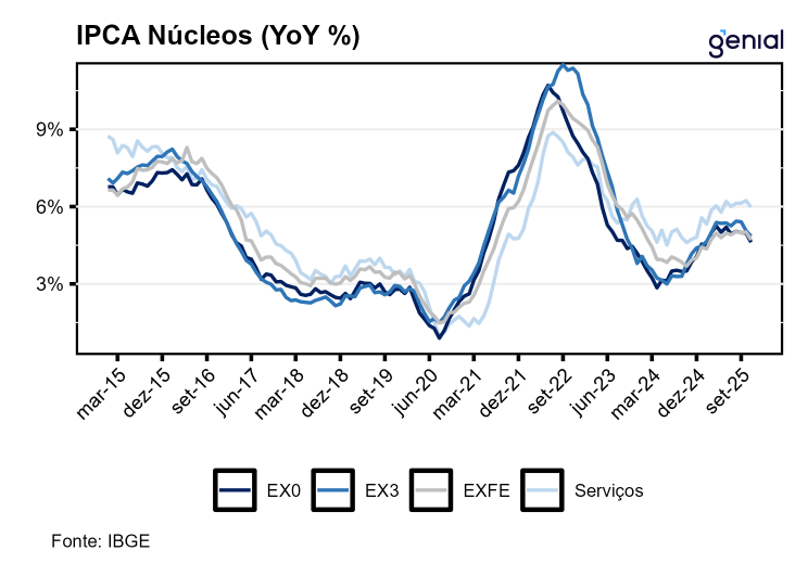 Serviços registraram variação de 0,60% m/m, um pouco abaixo do que nossa projeção de 0,64% m/m mas com composição melhor do que o esperado, com toda pressão baixista vindo do núcleo. Conserto de automóvel e seguro de veículo seguiram pressionando o núcleo para baixo, com o primeiro item vindo sistematicamente abaixo da nossa projeção já há algumas leituras. Havia um risco desses itens virarem para cima, em direção a alimentação fora e intensivos em trabalho, mas o contrário ocorreu, configurando um fator benigno para a leitura de novembro. Por outro lado, intensivos em trabalho seguem refletindo um mercado de trabalho ainda dinâmico. Hospedagem, pacote turístico e transporte por aplicativo foram as maiores contribuições altistas, mas os ex-subjacentes como um todo vieram dentro do esperado. O IPCA de novembro alivia o risco altista nos serviços apontado no report, e corrobora um IPCA de dezembro mais baixo.
