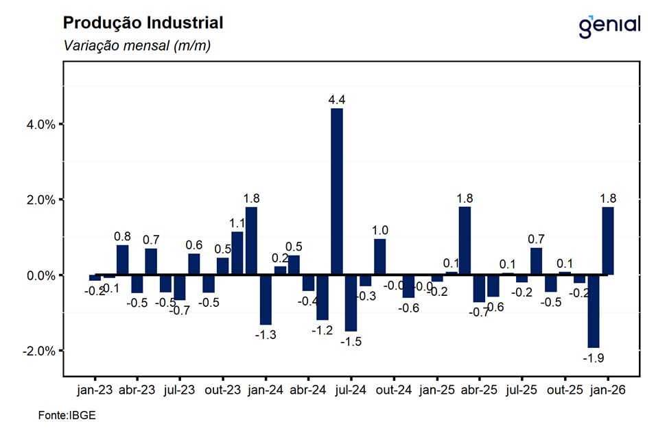Em janeiro, a Produção Industrial Mensal (PIM) registrou expansão de 1,8% m/m, número que superou o teto das projeções de mercado (1,6% m/m, Broadcast+) e a nossa expectativa para o mês de alta de 0,5% m/m, interrompendo uma sequência de três recuos consecutivos. Esse resultado foi reflexo da combinação entre os avanços de 1,2% m/m e 2,1% m/m das indústrias extrativas e de transformação, respectivamente. O resultado de janeiro sugere que a indústria inicia 2026 em uma posição mais favorável do que a observada no final do ano passado. Ainda assim, avaliamos que esse dado isolado não caracteriza uma recuperação do setor, que continua enfrentando desafios relevantes decorrentes de uma política monetária significativamente contracionista, cujos efeitos devem seguir pressionando seu desempenho ao longo dos próximos meses, fato este corroborado pela sua média móvel trimestral que registrou contração de 0,1%, sugerindo uma tendência de perda de dinamismo gradual.