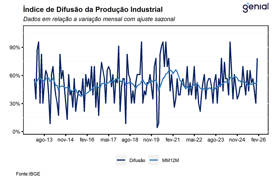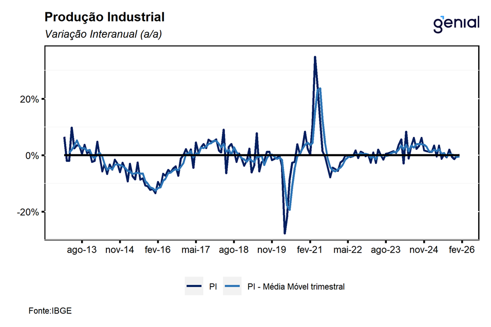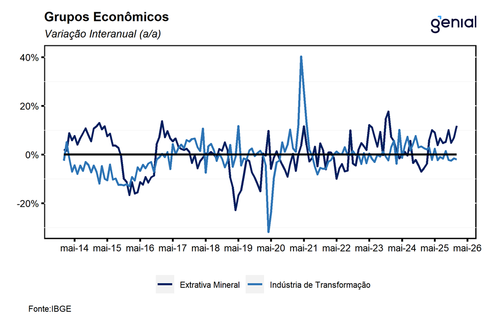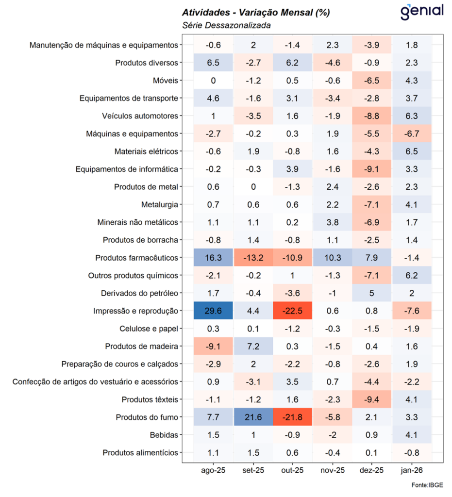 De modo geral, os dados divulgados hoje indicam uma melhora relativamente disseminada da indústria no início de 2026. Ainda assim, avaliamos que as perspectivas para os próximos meses permanecem desafiadoras para o setor, refletindo sobretudo o atual grau de contração da política monetária e as incertezas associadas ao ciclo econômico global e ao ambiente eleitoral doméstico, fatores que tendem a pesar especialmente sobre a indústria de transformação. Nesse contexto, entendemos que o resultado de hoje segue consistente com nossa expectativa de expansão de 0,9% t/t do PIB no 1T26, bem como com a avaliação de que o Copom deverá iniciar o ciclo de afrouxamento monetário na próxima reunião, com corte inicial de 50 bps.