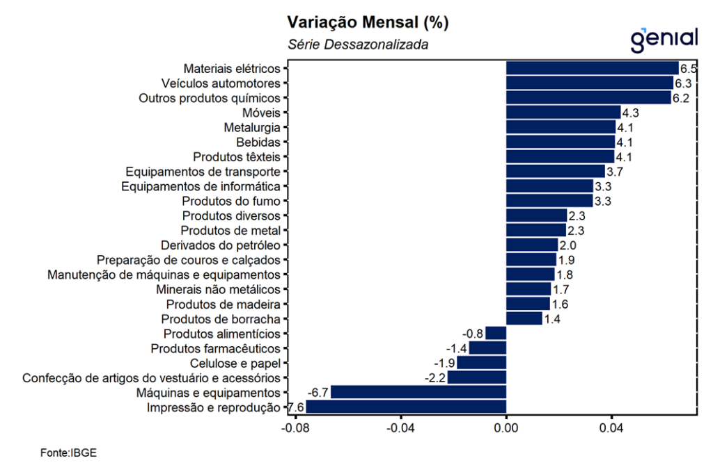 A alta registrada em janeiro foi derivada das expansões bastante disseminadas observadas em todas as 4 grandes categorias e em 19 dos 25 ramos de atividade pesquisados. Entre as categorias, os principais destaques ficaram pelas altas da produção de bens duráveis (6,3% m/m), refletindo principalmente o avanço de 18,1% m/m dos equipamentos de transporte não industrial; e de 2,0% m/m na produção de bens de capital, em função da alta de 14,2% m/m na produção de equipamentos de transporte industrial. As demais altas ficaram por conta das produções de bens intermediários (1,7% m/m), refletindo as altas de 3,9% m/m nas produções de insumos industriais básicos e insumos industriais elaborados, e de 2,1% m/m de alimentos e bebidas básicos destinados à indústria; e de bens de consumo semiduráveis e não duráveis (1,2% m/m), em função da alta de 2,5% m/m de alimentos e bebidas elaborados, destinados principalmente ao consumo doméstico. Entre as atividades, os principais destaques ficaram por conta das altas de 6,5% m/m na fabricação de máquinas, aparelhos e materiais elétricos, de 6,3% m/m de veículos automotores, reboques e carrocerias e de 6,2% m/m de produtos químicos.