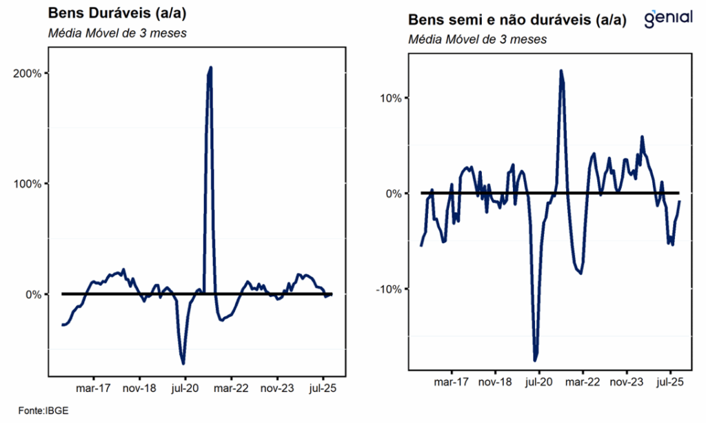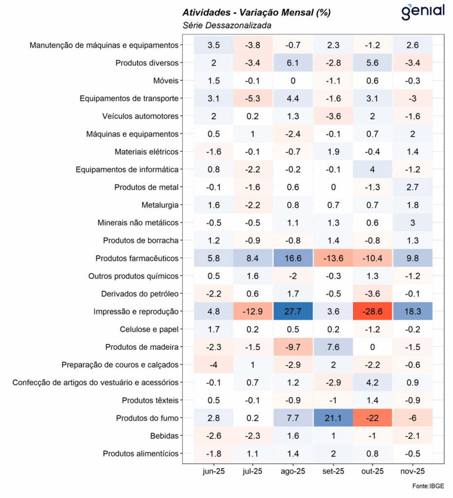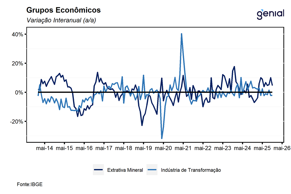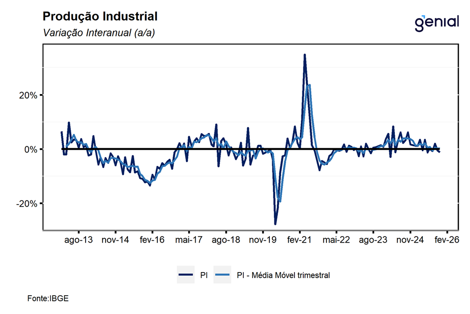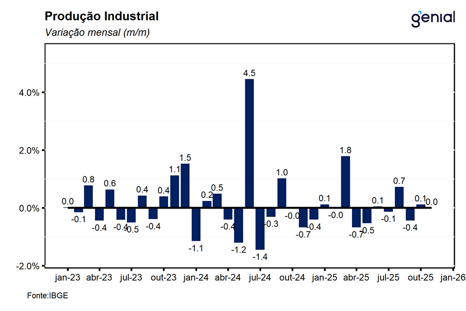 Em novembro, a produção industrial registrou estabilidade (0,0% m/m), vindo em linha com o esperado pelo mercado (Broadcast+), porém melhor do que a nossa expectativa para o mês, de contração de 0,2% m/m. A variação nula foi reflexo da combinação entre o forte recuo na indústria extrativa mineral que acabou sendo compensado por um ligeiro avanço da indústria de transformação, revertendo, ainda que parcialmente, os movimentos observados no mês imediatamente anterior dessas duas categorias. Com este resultado, a indústria segue operando próximo da estabilidade pelo segundo mês consecutivo, corroborando a nossa avaliação de que o cenário macroeconômico adverso será responsável por um processo de arrefecimento gradual da economia. Este fato é corroborado pela análise da média móvel trimestral que, pelo quinto mês consecutivo, opera próximo da estabilidade, sugerindo um desempenho lateralizado, ao longo do segundo semestre de 2025. Na comparação interanual, a indústria registrou queda de 1,2% a/a, vindo pior do que o esperado pelo consenso de mercado (-0,7% a/a, Broadcast+), contudo um pouco melhor do que a nossa expectativa para o mês de recuo de 1,5% a/a.