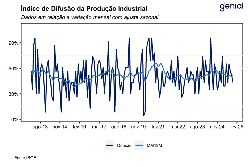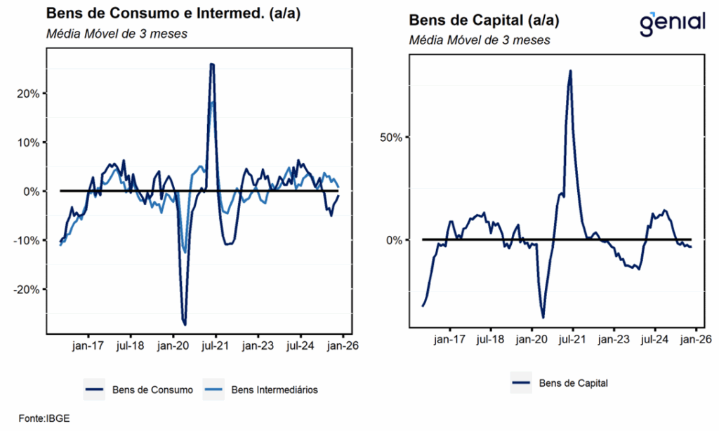 O relativo equilíbrio entre taxas positivas e negativas corroboram a nossa expectativa de que o processo de arrefecimento da indústria deve ocorrer de maneira gradual mesmo diante de um cenário marcado por uma taxa de juros significativamente contracionista. O desempenho bastante heterogêneo entre as médias móveis trimestrais das categorias que compõem o setor, oscilando entre altas e baixas, corrobora essa nossa avaliação e devem contribuir para sustentar um modesto avanço do PIB no último trimestre de 2025. Dessa forma, entendemos que o resultado de hoje segue corroborando a nossa expectativa de expansão do PIB no último trimestre de 0,1% t/t, de modo que, a economia deve ter registrado expansão de 2,3% no ano passado. ▪ Com estes resultados, a indústria se encontra 2,4% acima do nível pré-pandemia (fev/20) e 14,8% abaixo do nível mais elevado já registrado em sua série histórica (mai/11), com as indústrias de transformação e extrativa 1,0% e 11,7% acima do nível observado antes da pandemia, respectivamente. Dessa forma, a atividade industrial deixa um carrego estatístico de 0,0% para o crescimento no 4º trimestre e de 1,1% para o ano de 2025.