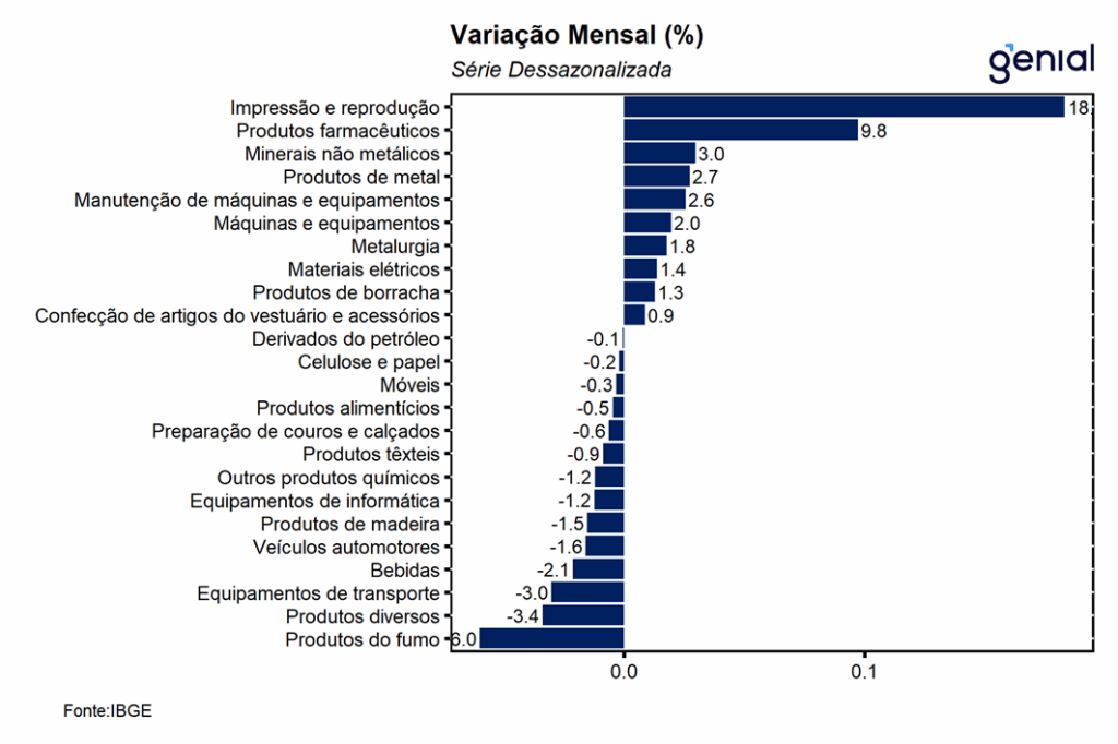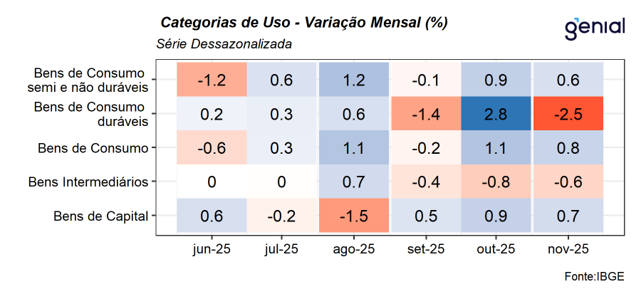 A estabilidade no mês foi derivada das altas observadas em 2 das 4 grandes categorias e em 15 dos 25 ramos pesquisados. Entre as categorias, as altas ficaram por conta dos desempenhos positivos observados na produção de Bens de capital (0,7% m/m), dando continuidade à uma sequência de duas altas consecutivas observadas nos meses imediatamente anteriores, refletindo principalmente as altas que vêm sendo observadas na produção de bens exceto equipamentos de transporte industrial (1,4% m/m); e na produção de Bens de consumo semiduráveis e não duráveis (0,6% m/m), dando continuidade à alta de 0,9% m/m observada em outubro, refletindo principalmente as expansões de 4,3% m/m e de 2,4% m/m na produção de bens de consumo não duráveis e semiduráveis, respectivamente. Na ponta negativa, o principal recuo ficou por conta da produção de Bens de consumo duráveis (-2,5% m/m), compensando parcialmente o avanço de 2,8% m/m observado na leitura anterior, sendo este movimento derivado do recuo de todos os componentes que compõem a categoria, com destaque para a queda de 3,0% na produção de Bens de consumo duráveis exceto automóveis e equipamentos de transporte não industrial. Por fim, tivemos também recuo na produção de bens intermediários (-0,6% m/m), dando continuidade à uma sequência de duas quedas consecutivas nos meses anteriores, refletindo principalmente os recuos observados na produção de combustíveis e lubrificantes básicos (-4,5% m/m), alimentos e bebidas destinadas à indústria (-3,9% m/m) e combustíveis e lubrificantes elaborados (-2,4% m/m).