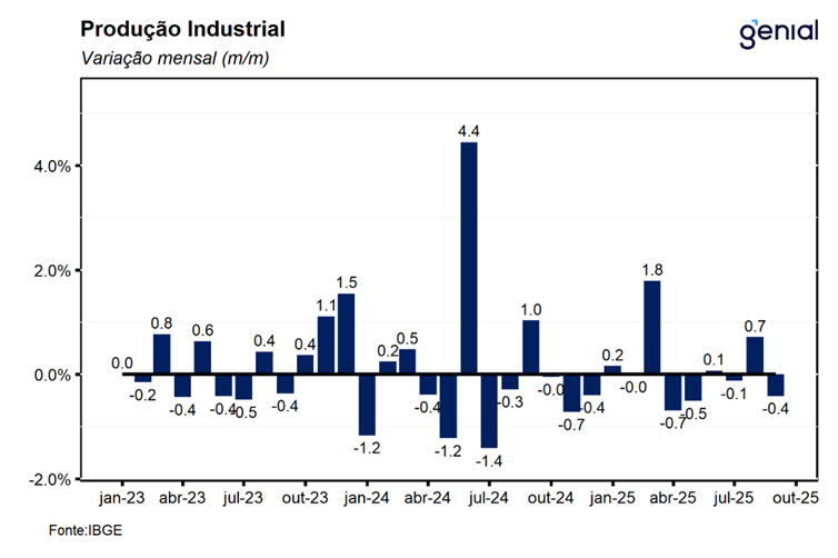 Em setembro, a produção industrial registrou recuo de 0,4% m/m, vindo em linha com o esperado pelo mercado (Broadcast+), porém significativamente melhor do que a nossa projeção para o mês (-0,9% m/m), refletindo principalmente um desempenho mais forte da indústria de transformação no período. Com este resultado, o setor reverte parcialmente a expansão de 0,7% m/m observada no mês imediatamente anterior, sugerindo um desempenho mais moderado da atividade industrial ao longo do terceiro trimestre de 2025. Na comparação interanual, houve expansão de 2,0% a/a, vindo ligeiramente melhor do que o esperado pelo mercado (1,8% a/a, Broadcast+) e acima da nossa expectativa para o mês de alta de 1,3% a/a. Na nossa avaliação, o desempenho acima do esperado no mês corrobora a leitura de que, apesar do ambiente macroeconômico mais desafiador, o processo de desaceleração deve ocorrer de maneira gradual ao longo dos próximos meses.