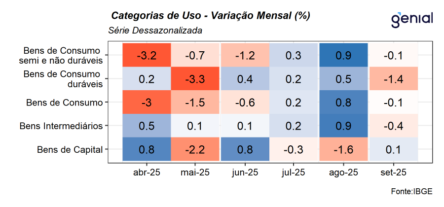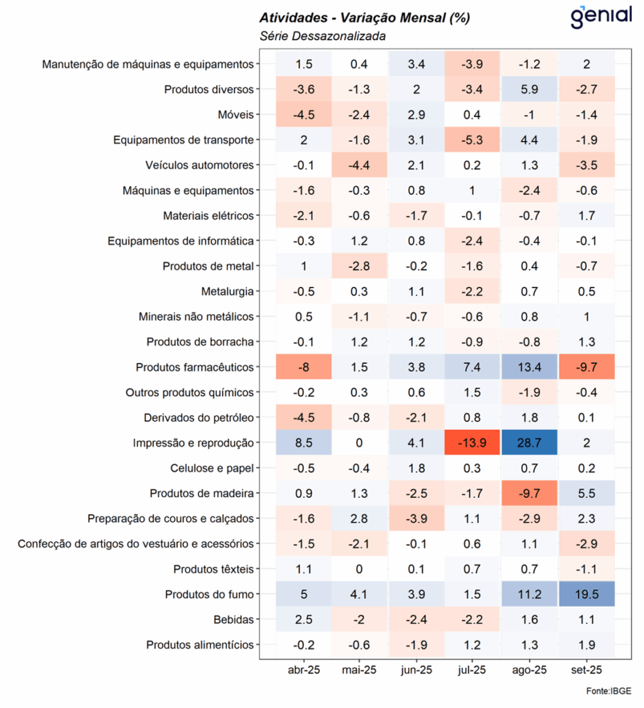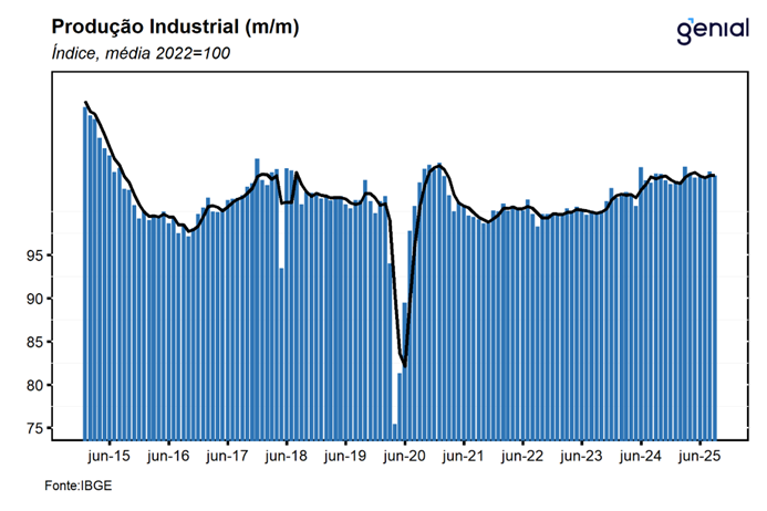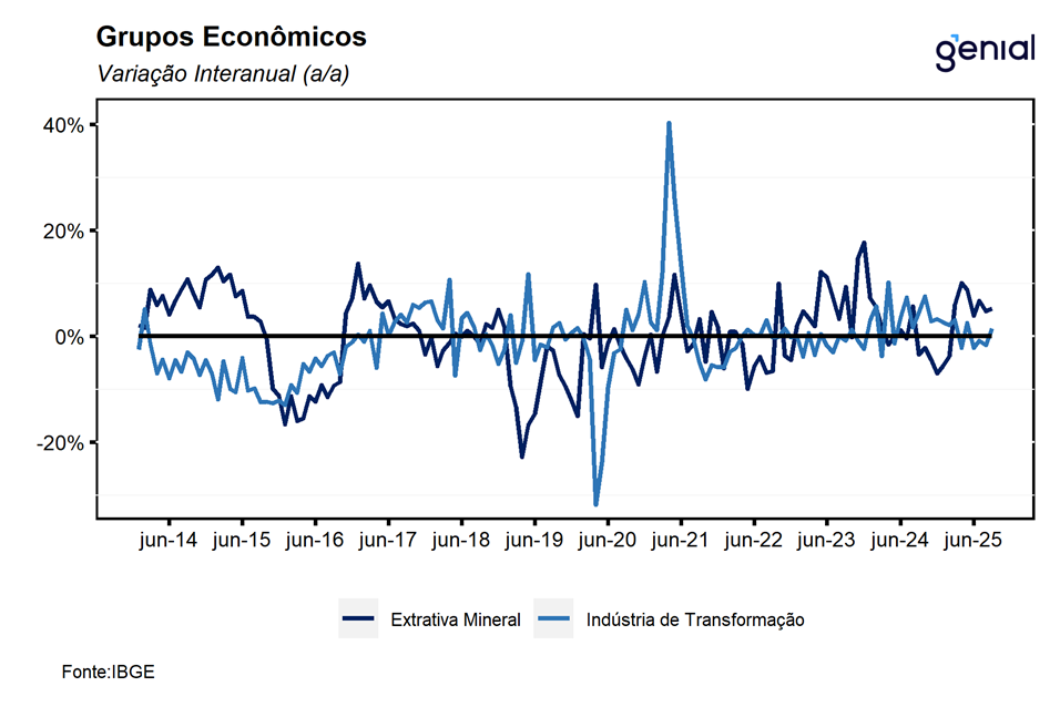 De maneira geral, os dados de setembro seguem corroborando as nossas expectativas de arrefecimento da atividade industrial ao longo dos próximos meses, refletindo um cenário macroeconômico que tende a se manter mais adverso. Apesar do mercado de trabalho resiliente e as medidas de estímulo à demanda seguirem exercendo um importante papel de impulso ao crescimento no ano, a política monetária contracionista e a elevação das incertezas devem pesar de maneira mais significativa sob a indústria, principalmente a de transformação, através do aumento do custo de financiamento e a queda na intenção de investir por parte dos empresários. Nesse cenário, seguimos projetando um desempenho heterogêneo entre os ramos industriais. Enquanto a indústria de transformação deve seguir pressionada pelo ambiente econômico adverso, a indústria extrativa tende a apresentar performance mais favorável, sustentada por seu caráter menos cíclico e por condições climáticas mais benignas. Com o resultado de setembro, mantemos nossa projeção de crescimento do PIB em 0,3% t/t no terceiro trimestre e de 2,3% para o acumulado de 2025.