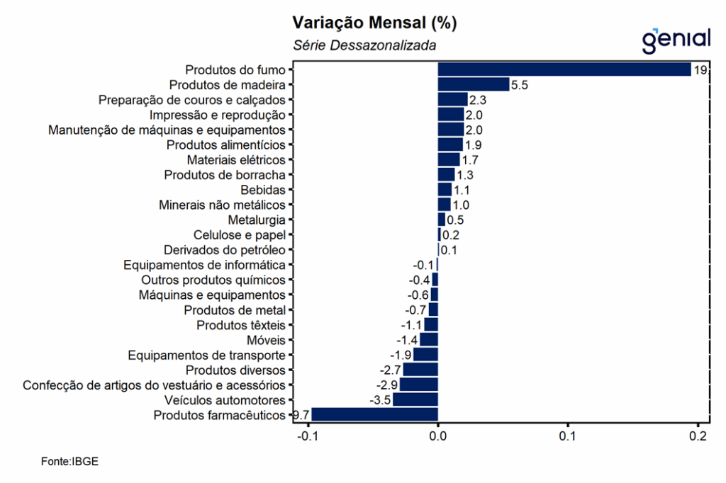 O desempenho negativo no mês foi derivado dos recuos em três das quatro grandes categorias e 12 dos 25 ramos pesquisados. O principal destaque ficou por conta do recuo na produção de bens duráveis (-1,4% m/m), interrompendo uma sequência de três altas consecutivas observadas nos meses imediatamente anteriores, refletindo, em grande parte, o recuo de 10,7% m/m na produção de equipamentos de transporte não industrial e de -2,7% m/m na produção de automóveis para passageiros. As demais quedas ficaram por conta da produção de bens intermediários (-0,4% m/m), refletindo os recuos nas produções de peça e acessórios para bens de capital (-3,9% m/m) e combustíveis e lubrificantes básicos (-2,5% m/m); e nos bens de consumo semiduráveis (-0,1% m/m). Por outro lado, a única alta no mês ficou por conta da produção de bens de capital (0,1% m/m), interrompendo uma sequência de dois recuos consecutivos no qual o indicador acumulou uma contração de 1,9%, derivado da combinação entre a alta de 3,0% m/m na produção de equipamentos de transporte industrial e o recuo de 1,0% m/m na produção de bens de capital, exceto equipamentos de transporte industrial. O resultado no mês marcado por taxas predominantemente negativas e uma alta próxima a estabilidade sugere que o ciclo de aperto monetário em curso, somado ao aumento das incertezas, continua pesando sobre o setor que é mais afetado pelo crédito e pela intenção de investimento por parte dos empresários.