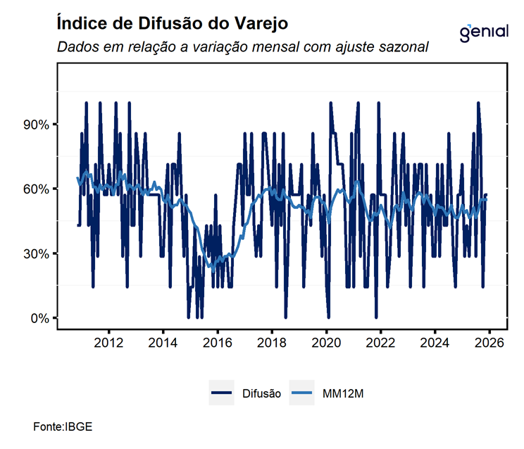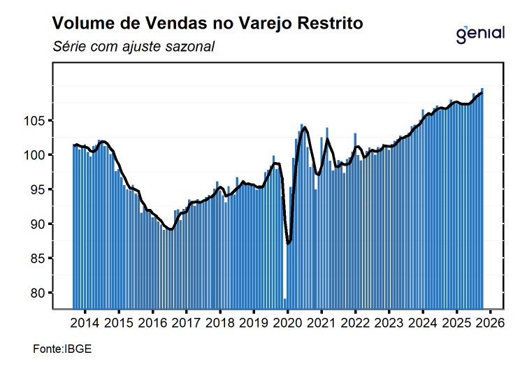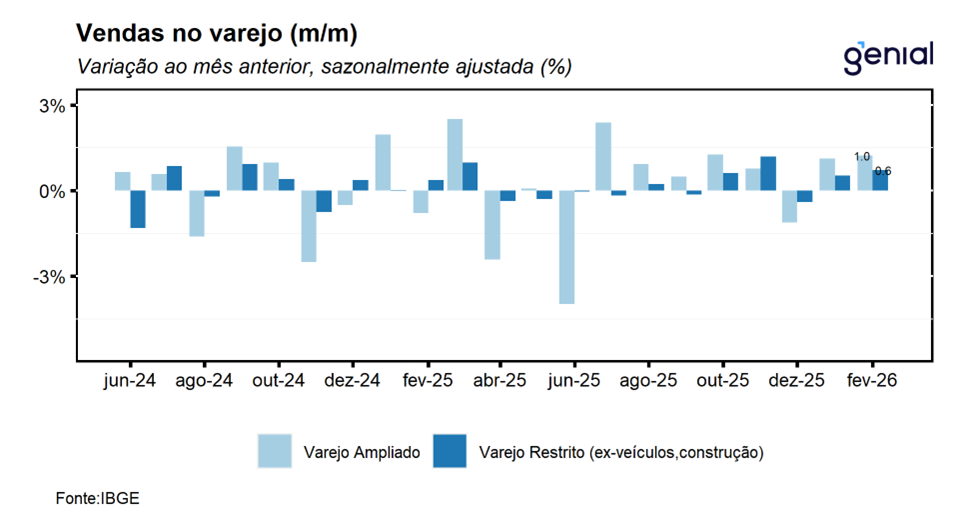 Em fevereiro, o volume de vendas do varejo (restrito) avançou 0,6% m/m, vindo melhor do que o esperado pelo mercado (0,9% m/m, Broadcast+), porém um pouco mais em linha com a nossa expectativa de alta de 0,8% m/m, renovando o nível mais elevado já registrado da série histórica. Com este resultado, o varejo dá continuidade ao avanço registrado em janeiro, de modo que, a sua média móvel trimestral desacelerou saiu de 0,4% para 0,2%, dando continuidade à sequência de 4 altas consecutivas registradas nos meses imediatamente anteriores. Na nossa avaliação, os números de hoje seguem corroborando a nossa expectativa de que, mesmo diante de um cenário macroeconômico bastante adverso, a economia brasileira deve permanecer resiliente ao longo de 2026, com um arrefecimento bastante gradual em relação ao ano passado. Já na comparação interanual, as vendas no varejo cresceram 0,2% a/a, ficando aquém do consenso de mercado de alta de 1,2% a/a (Broadcast+), porém mais em linha com a nossa expectativa de avanço de 0,7% a/a.
