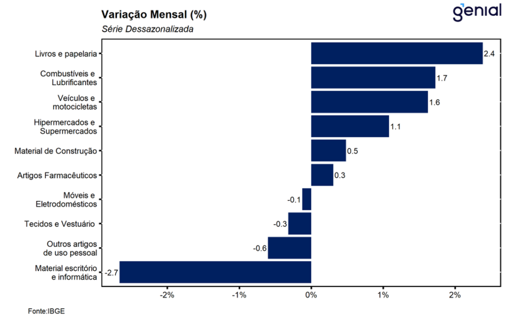 O avanço do varejo em fevereiro foi explicado pelas altas de 4 das 8 atividades pesquisadas, cujo equilíbrio entre taxas positivas e negativas também corrobora a nossa avaliação de que a atividade varejista, deve apresentar um desempenho moderado ao longo dos próximos meses devido ao cenário macroeconômico que ainda se mostra bastante adverso. Os principais destaques positivos ficaram por conta das altas observadas nas vendas de hipermercados e supermercados (1,1% m/m), segmento que compõe mais de 50% do índice, renovando o nível mais elevado já registrado em sua série histórica; livros, jornais, revistas e papelaria (2,4% m/m), interrompendo uma sequência de dois recuos consecutivos observados nos meses imediatamente anteriores; e combustíveis e lubrificantes (1,7% m/m), revertendo o recuo de 1,1% m/m observado em janeiro. Além disso, tivemos o avanço de 0,3% m/m nas vendas de artigos farmacêuticos, médicos, ortopédicos de perfumaria e cosméticos.