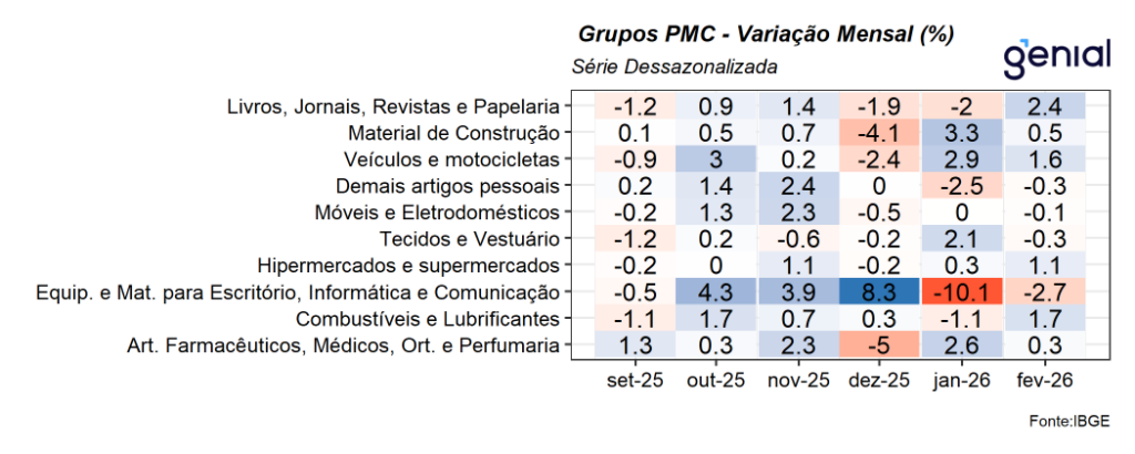 Entre as baixas, destacamos o recuo de 2,7% m/m nas vendas de equipamentos e material para escritório, informática e comunicação, dando continuidade ao recuo de 10,1% a/a do mês imediatamente anterior e devolve as altas observadas ao longo do último trimestre de 2025; das vendas de outros artigos de uso pessoal e doméstico (-0,6% m/m), compensando parcialmente o avanço de 0,8% m/m de janeiro; nas vendas de tecidos, vestuário e calçados (-0,3% m/m); e de -0,1% nas vendas de móveis e eletrodomésticos. Com relação ao varejo ampliado, o resultado no mês refletiu também a alta de 1,6% m/m nas vendas de veículos, motos, partes e peças e de 0,5% m/m de material de construção.