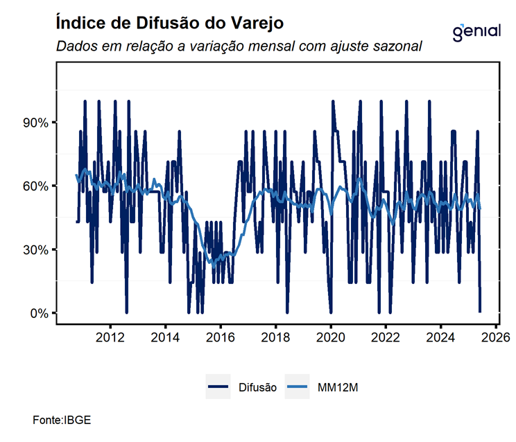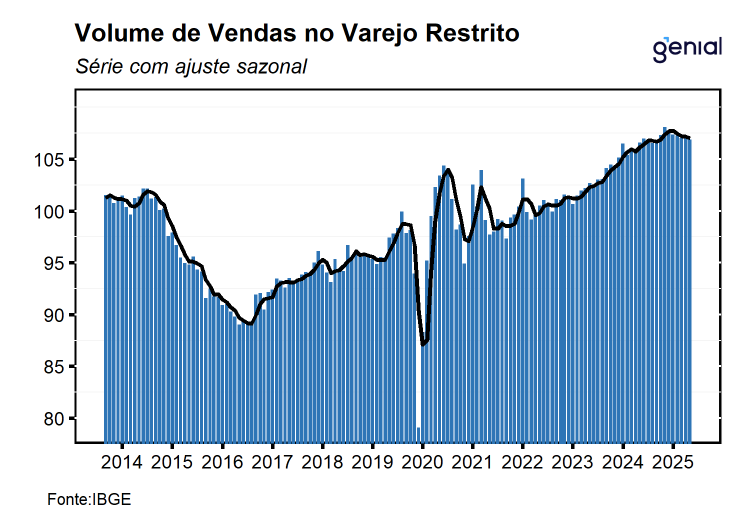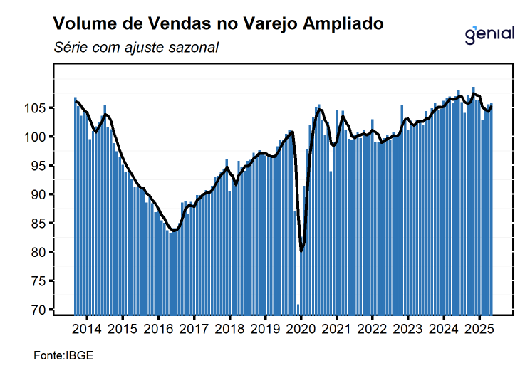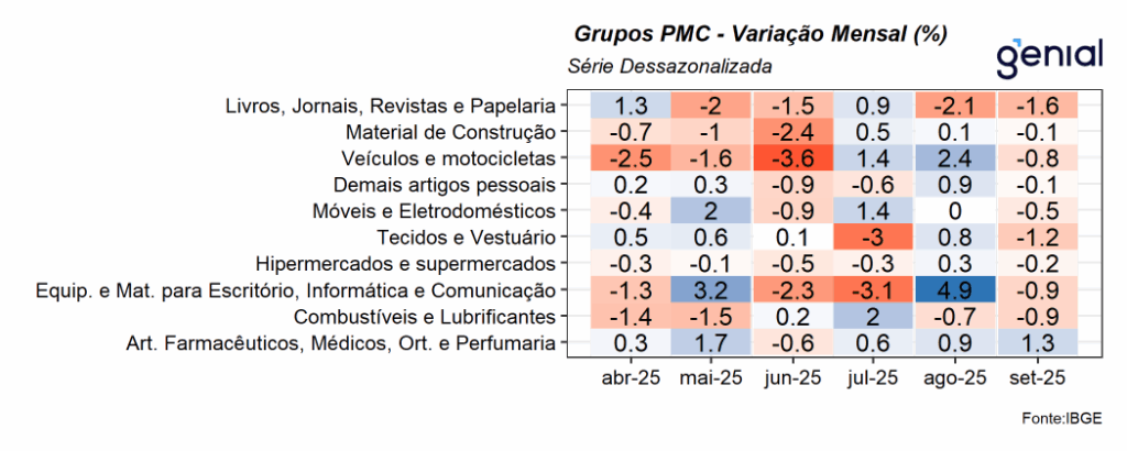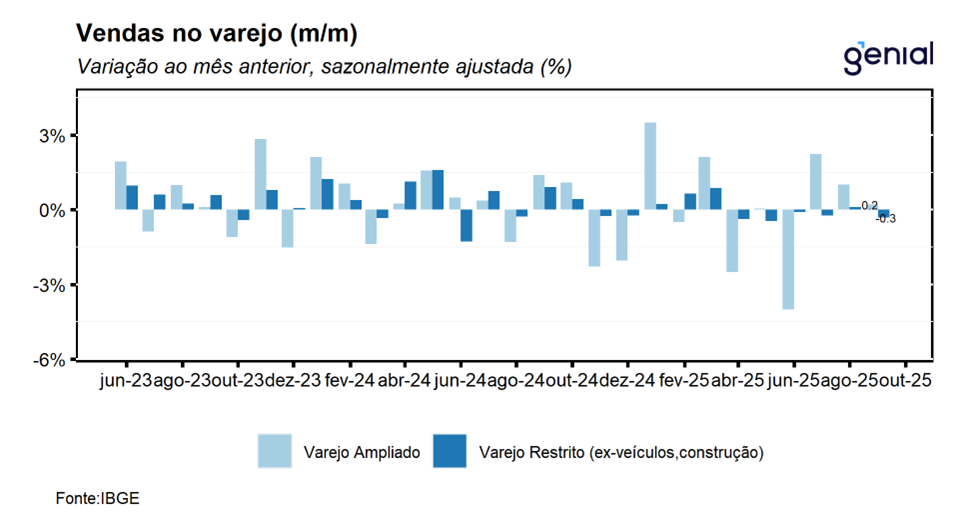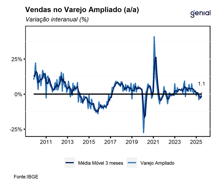 O varejo ampliado — que inclui Veículos, Motos, Partes e Peças; Materiais de Construção; e Atacado de Produtos Alimentícios — cresceu 0,2% m/m em setembro, dando continuidade às duas altas registradas nos meses anteriores. O resultado ficou ligeiramente acima do consenso de mercado (0,1% m/m, Broadcast+), mas marginalmente abaixo da nossa projeção de 0,3% m/m. Apesar da leitura positiva, é importante destacar que tanto as vendas de veículos, motos, partes e peças quanto as de materiais de construção recuaram no mês, devolvendo parte dos avanços prévios. Assim, a alta do varejo ampliado foi sustentada quase exclusivamente pelo desempenho do atacado especializado em produtos alimentícios, bebidas e fumo. Com o resultado de setembro, a média móvel trimestral do varejo ampliado voltou ao terreno positivo, com alta de 1,0%. Ainda assim, avaliamos que essa recuperação tende a perder força nos próximos meses, à medida que a forte expansão de 1,9% m/m registrada em julho deixa a base de comparação. Nesse contexto, a persistente disseminação de quedas dentro dos segmentos mais dependentes de crédito reforça que a política monetária contracionista continua afetando de forma mais intensa os setores mais sensíveis ao crédito. Na comparação interanual, as vendas cresceram 1,1% a/a, ligeiramente acima do consenso (1,0% a/a), mas aquém da nossa estimativa de 1,4% a/a.