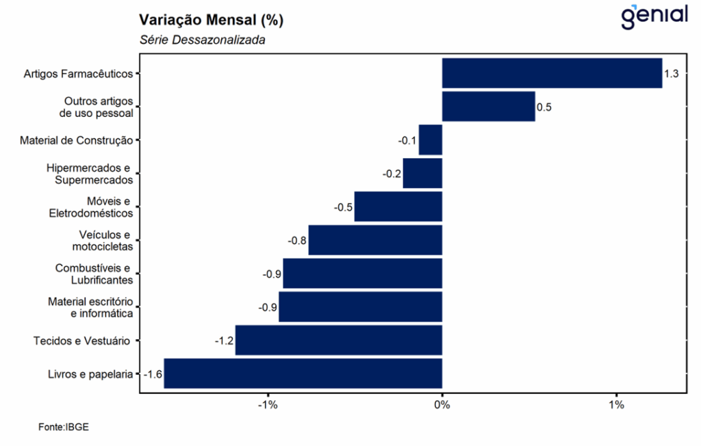 O recuo do varejo em setembro foi explicado pelo recuo de seis das oito atividades pesquisadas. Entre as quedas, os principais destaques ficaram por conta das vendas de Livros, jornais, revistas e papelaria (-1,6% m/m), dando continuidade ao recuo de 2,1% m/m observado no mês imediatamente anterior; nas vendas de Tecidos, vestuário e calçados (-1,2% m/m), após expansão de 0,8% m/m em agosto devido ao efeito calendário do Dia dos Pais; Combustíveis e lubrificantes (-0,9% m/m); e Equipamentos e materiais para escritório, informática e comunicação (-0,9% m/m). Os demais recuos ficaram por conta das vendas de Móveis e eletrodomésticos (-0,5% m/m), interrompendo uma sequência de dois resultados não negativos; e nas vendas nos Hipermercados e supermercados (-0,2% m/m), revertendo parcialmente o avanço de 0,3% m/m de agosto. Na ponta positiva, tivemos as altas de 1,3% m/m nas vendas de Artigos farmacêuticos, médicos, ortopédicos e de perfumaria (1,3% m/m) e o avanço de 0,5% m/m de Outros artigos de uso pessoal e doméstico.