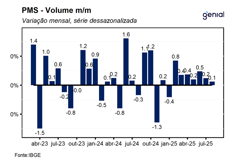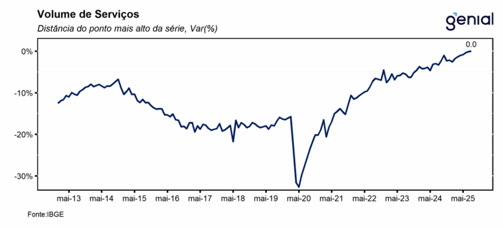 Com o resultado de agosto e as revisões nos meses anteriores, o setor de serviços se encontra 18,7% acima do nível pré-pandemia e opera no nível mais elevado já registrado em sua série histórica. Além disso, cabe destacar que, com o resultado de agosto, o setor de serviços acumula alta de 2,2% no ano e deixa um carrego estatístico de 0,7% para o terceiro trimestre e de 2,6% para o ano cheio de 2025.