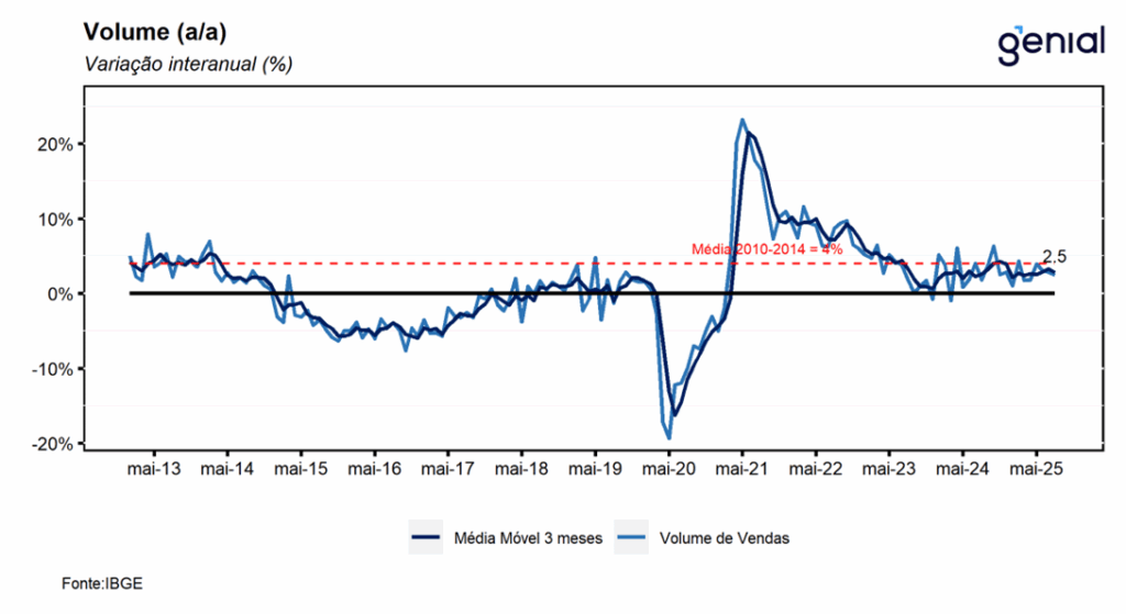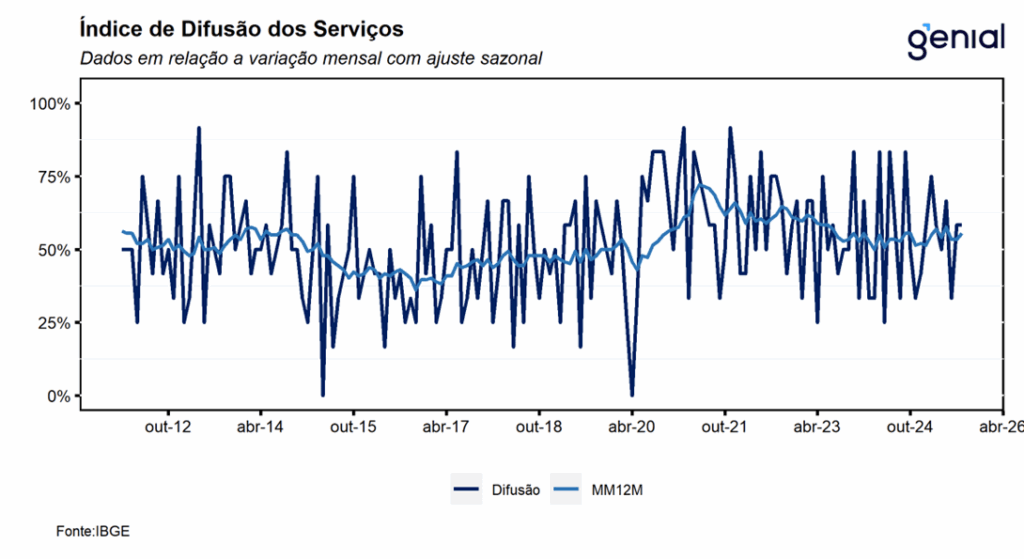 Com os resultados mais recentes, a média móvel trimestral do volume de serviços manteve alta de 0,3%, repetindo o desempenho observado nos meses anteriores e reforçando a percepção de que o setor segue operando em terreno positivo, ainda que com crescimento mais moderado. O dado corrobora nossa avaliação de que, mesmo diante de um ambiente macroeconômico desafiador — com inflação elevada, política monetária restritiva e elevado grau de incerteza —, o setor de serviços permanece resiliente e deve sustentar um processo gradual de arrefecimento da economia brasileira. Os impactos negativos desse cenário seguem sendo compensados por uma política fiscal expansionista e por um mercado de trabalho ainda aquecido, enquanto os principais segmentos do setor seguem oscilando próximos à estabilidade, afastando, por ora, a hipótese de que a política monetária esteja provocando um recuo mais expressivo da atividade.