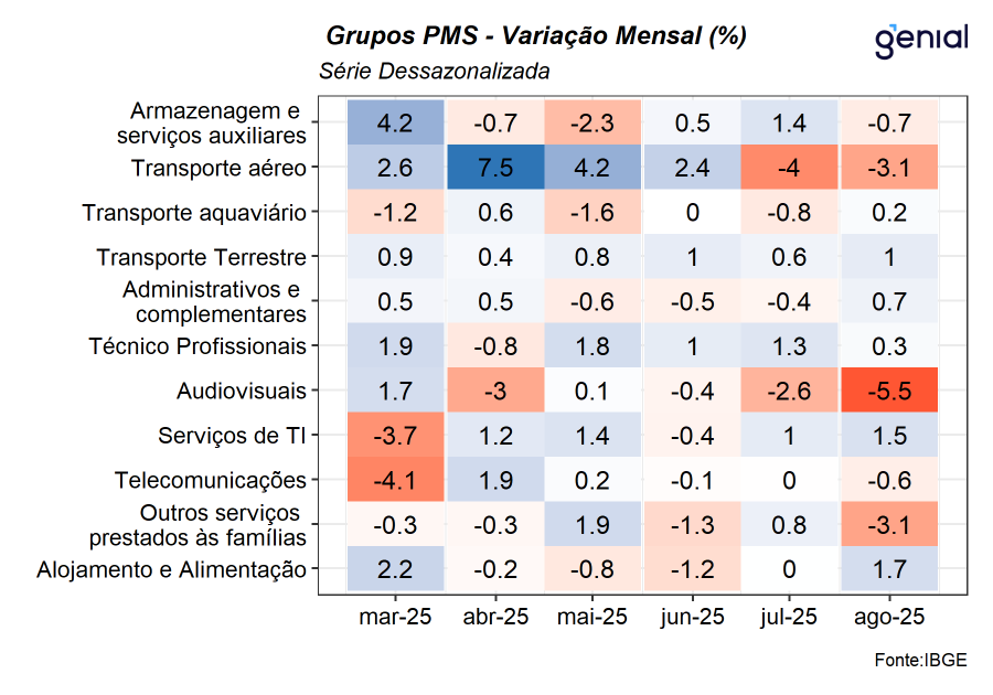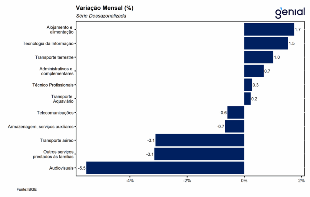 O desempenho no mês foi marcado pela alta de quatro das cinco grandes categorias pesquisadas. O principal destaque positivo ficou por conta da alta observada nos serviços prestados às famílias (1,0% m/m), dando continuidade à alta de 0,3% m/m observada em julho e refletiu a combinação entre a alta de 1,7% m/m nos serviços de alojamento e alimentação que foram parcialmente compensados pelo recuo de 3,1% m/m nos outros serviços prestados às famílias. Além disso, destacamos também o avanço, pelo quarto mês consecutivo, dos serviços profissionais, administrativos e complementares (0,4% m/m), derivado das altas de 0,3% m/m dos serviços técnico-profissionais e de 0,7% m/m dos serviços administrativos e complementares. As demais altas ficaram por conta dos serviços de transportes, serviços auxiliares aos transportes e correio (0,2% m/m) e outros serviços (0,6% m/m). Na ponta negativa, o único recuo ficou por conta dos serviços de informação e comunicação (-0,5% m/m), revertendo a expansão de mesma magnitude registrada no mês imediatamente anterior, refletindo principalmente o forte recuo (-5,5% m/m) de serviços audiovisuais, de edição e agência de notícias.