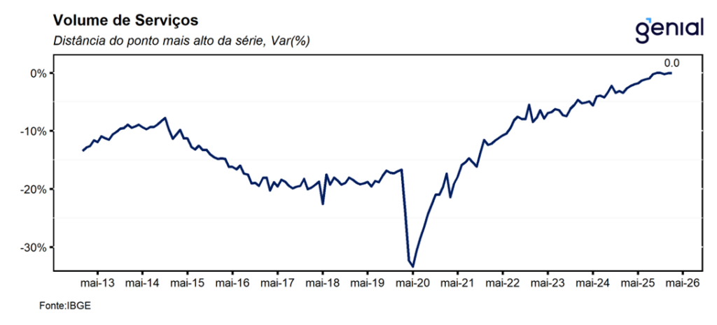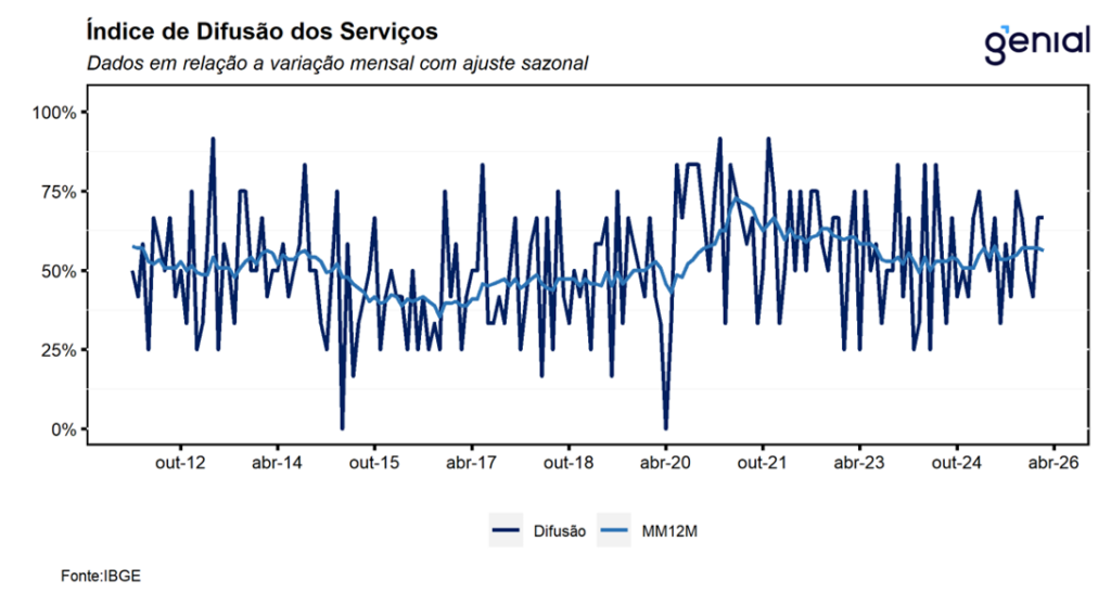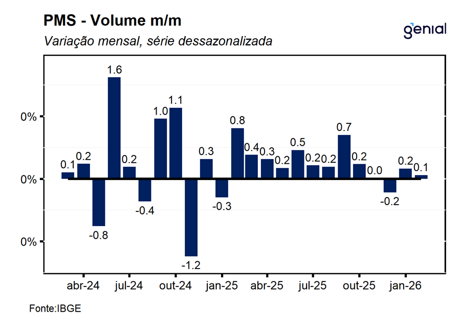 Com o resultado mais recente, a média móvel trimestral do volume de serviços permaneceu estável (0,0%), corroborando a nossa expectativa de arrefecimento gradual da economia brasileira. Apesar disso, cabe destacar que segmentos mais ligados ao consumo das famílias apresentam reaceleração nesse início de ano, estando em linha com a nossa expectativa de recuperação dessa abertura do PIB no 1T26 por conta das políticas de estímulo à demanda aprovadas pelo governo. Nesse sentido, avaliamos que o resultado de hoje do setor de serviços segue corroborando a nossa expectativa de expansão do PIB de 0,9% t/t no primeiro trimestre de 2026, de modo que, a economia brasileira deve registrar alta de 2,0% no ano de 2026.