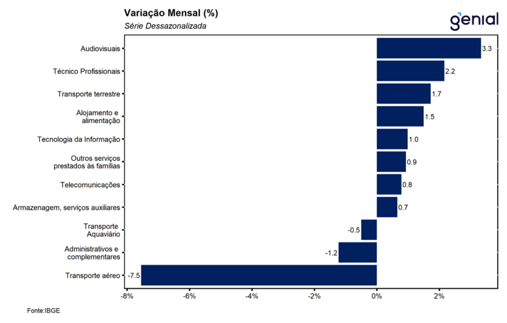 A expansão do índice geral foi decorrente das altas de 3 das 5 atividades pesquisadas. O principal destaque no mês ficou por conta da expansão de 1,1% m/m dos serviços de informação e comunicação, dando continuidade à sequência de duas altas consecutivas observadas nos meses imediatamente anteriores, de modo que, o indicador renovou o nível mais elevado já registrado em sua série histórica. Este resultado reflete principalmente a expansão de 3,3% m/m dos serviços audiovisuais, de edição e agências de notícias e em menor magnitude o avanço de 0,9% m/m dos serviços de tecnologia da informação e comunicação (TIC) que também renovaram o patamar recorde da série histórica. Além disso, tivemos avanço de 1,4% m/m dos serviços prestados às famílias, retornando para o campo positivo após recuar 0,5% m/m em janeiro, refletindo as altas de 1,5% m/m nos serviços de alojamento e alimentação e de 0,9% m/m em outros serviços prestados às famílias, com ambas revertendo as quedas observadas em janeiro. Por fim, houve expansão de 0,6% m/m dos serviços de transportes, serviços auxiliares aos transportes e correio, dando continuidade ao avanço de 0,2% m/m registrado em janeiro, tendo como principal destaque a expansão de 1,7% m/m do transporte terrestre que interrompeu uma sequência de dois recuos consecutivos nos meses imediatamente anteriores.