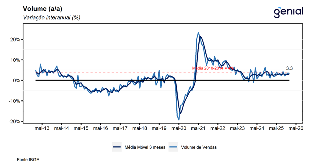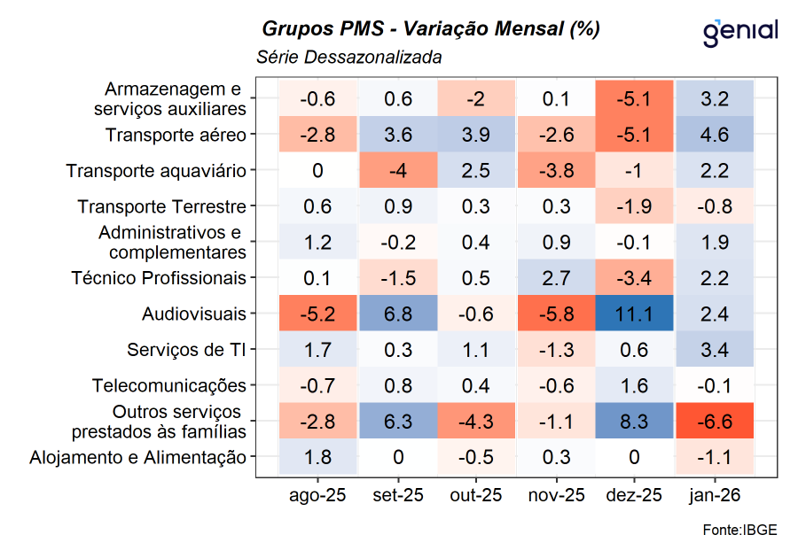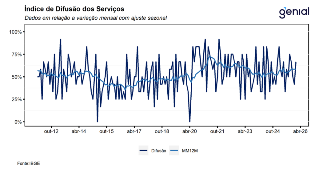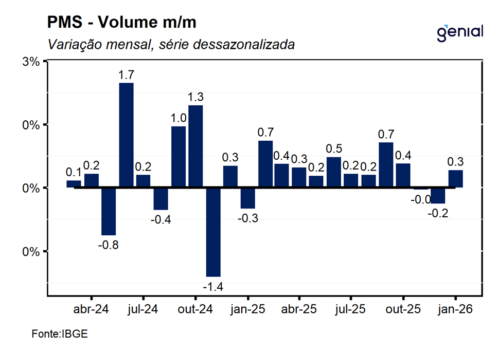 Com o resultado mais recente, a média móvel trimestral do volume de serviços permaneceu estável (0,0%), reforçando a nossa percepção de que o segmento deve contribuir para que a economia apresente uma trajetória de arrefecimento bastante gradual mesmo diante de um cenário significativamente desafiador. Nesse sentido, avaliamos que o resultado de hoje do setor de serviços corrobora a nossa expectativa de expansão do PIB de 0,9% t/t no primeiro trimestre de 2026, de modo que, a economia brasileira deve registrar alta de 2,0% no ano de 2026.