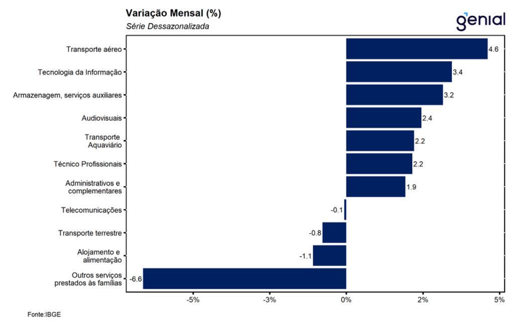 A expansão do índice geral foi decorrente das altas de 3 das 5 atividades pesquisadas. O principal destaque ficou por conta do avanço de 3,7% m/m dos outros serviços, revertendo parcialmente o recuo de 4,2% m/m observados no final do ano passado. As demais altas ficaram por conta dos serviços de informação e comunicação (1,0% m/m), refletindo principalmente as altas de 3,4% m/m dos serviços de tecnologia da informação e de 2,4% m/m dos serviços audiovisuais, de edição e agências de notícias, e de 0,4% m/m dos transportes, interrompendo uma sequência de duas contrações consecutivas nos meses imediatamente anteriores, sendo puxado pelo avanço do transporte aéreo (4,6% m/m) e dos serviços de armazenagem, auxiliares de transportes e correio (3,2% m/m). Na ponta negativa, tivemos o recuo dos serviços prestados às famílias (1,2% m/m), refletindo o recuo de 6,6% m/m do segmento de outros serviços prestados às famílias, devolvendo parte do avanço de 8,3% m/m observados no final do ano passado. Por fim, os serviços profissionais, administrativos e complementares ficaram estáveis no mês (0,0% m/m).