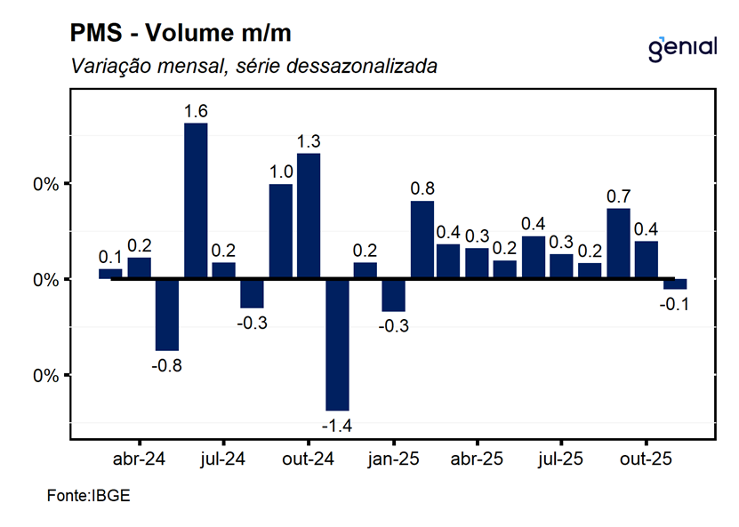 Em nossa avaliação, o resultado de novembro reforça a visão de que o processo de desaceleração da economia brasileira deve se dar de forma gradual no último trimestre do ano. Mesmo diante de um ambiente macroeconômico bastante adverso, a atividade segue sendo sustentada por um mercado de trabalho aquecido, medidas de estímulo à demanda e por conta de mudanças estruturais em hábitos de consumo que seguem impulsionando o transporte de cargas. Nesse contexto, avaliamos que o dado de hoje segue corroborando a nossa expectativa de que o PIB tenha avançado 0,1% t/t no último trimestre de 2025, de modo que, a economia deve ter registrado crescimento de 2,3% no ano cheio.