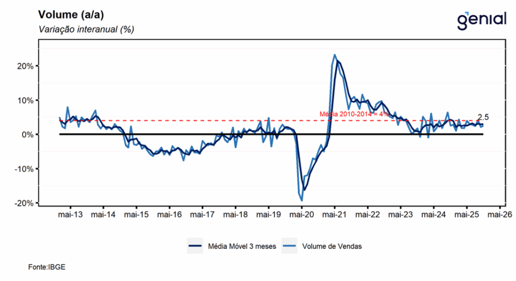 Com o resultado mais recente, a média móvel trimestral do volume de serviços registrou alta de 0,3%, seguindo praticamente estável ao longo das últimas 7 leituras e reforça a nossa percepção de que o segmento segue resiliente mesmo diante de um cenário macroeconômico significativamente desafiador. O dado corrobora a nossa avaliação de que o setor de serviços deve contribuir para que o processo de arrefecimento da economia como um todo ocorra de maneira bastante gradual, se beneficiando de um mercado de trabalho que ainda se mostra aquecido e uma política fiscal expansionista.