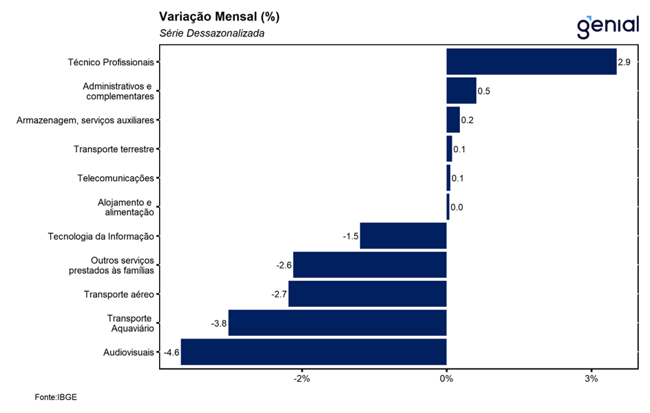 Apesar do índice geral ter registrado queda em novembro, o desempenho no mês foi marcado pelo recuo de apenas duas das cinco grandes categorias pesquisadas. O destaque negativo ficou por conta do recuo de 1,4% m/m no segmento de Transportes, serviços auxiliares aos transportes e correio, interrompendo uma sequência três altas consecutivas nos meses imediatamente anteriores, refletindo os recuos de 3,8% m/m e 2,7% m/m nos transportes aquaviário e aéreo, respectivamente. O outro recuo ficou por conta dos serviços de Informação e comunicação (-0,7% m/m), após ter avançado por dois meses consecutivos, tendo como destaque o recuo de 4,6% m/m nos serviços audiovisuais, de edição e agências de notícias. Na ponta positiva, houve alta de 1,3% m/m nos serviços Profissionais, administrativos e complementares, refletindo o principalmente o avanço de 2,9% m/m dos serviços Técnico-profissionais, de modo que, o indicador atingiu o nível mais elevado já registrado em sua série histórica. Além disso, tivemos o avanço de 0,5% m/m nos Outros serviços. Por fim, os serviços Prestados às famílias registraram estabilidade no mês, sendo este resultado derivado da combinação entre a estabilidade também registrada nos serviços de Alojamento e alimentação e o recuo de 2,6% m/m na categoria de Outros serviços prestados às famílias.