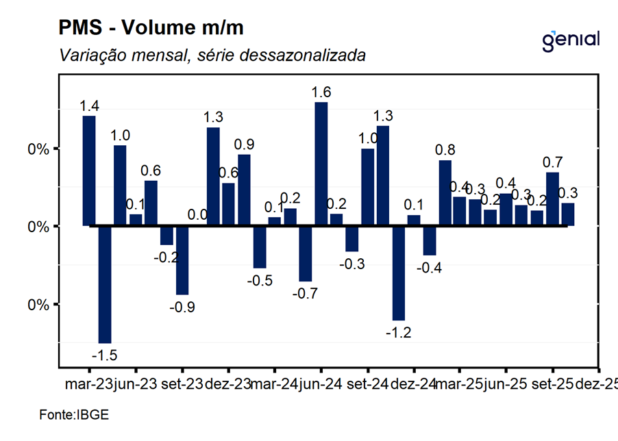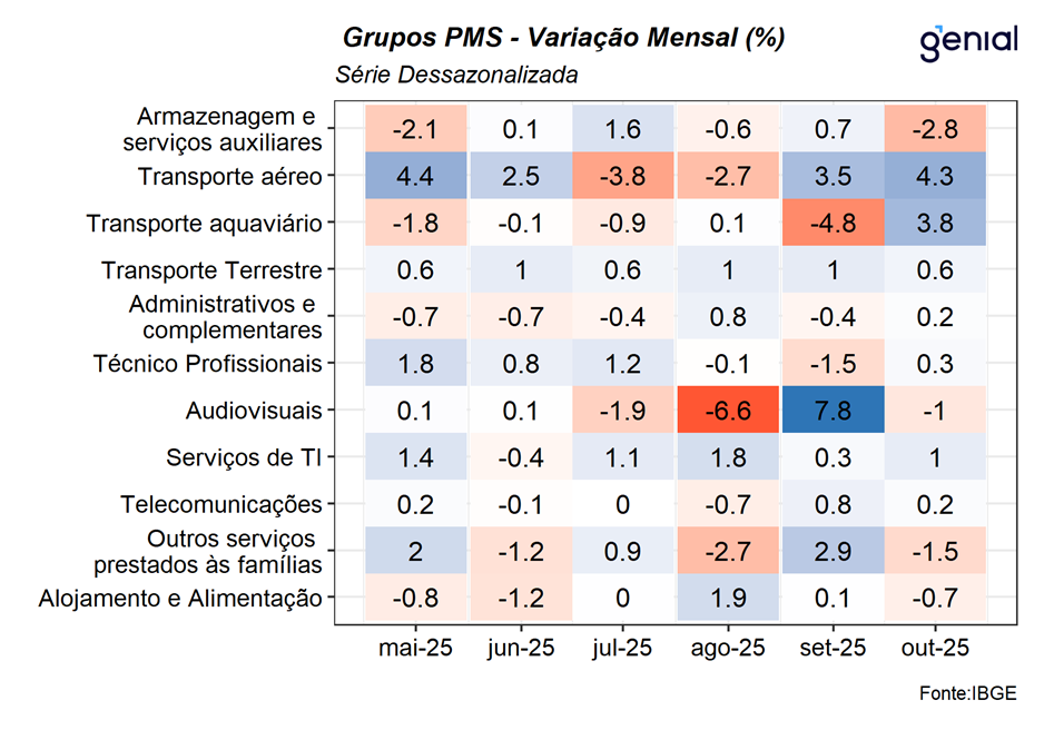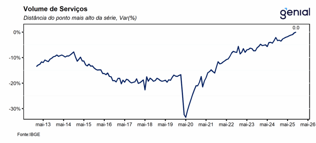 Com o resultado de outubro e as revisões nos meses anteriores, o setor de serviços se encontra 20,1% acima do nível pré-pandemia e opera no nível mais elevado já registrado em sua série histórica. Além disso, cabe destacar que com este resultado, o setor de serviços acumula alta de 3,3% no ano e deixa um carrego estatístico de 0,8% para o quarto trimestre e de 3,0% para o ano cheio de 2025.