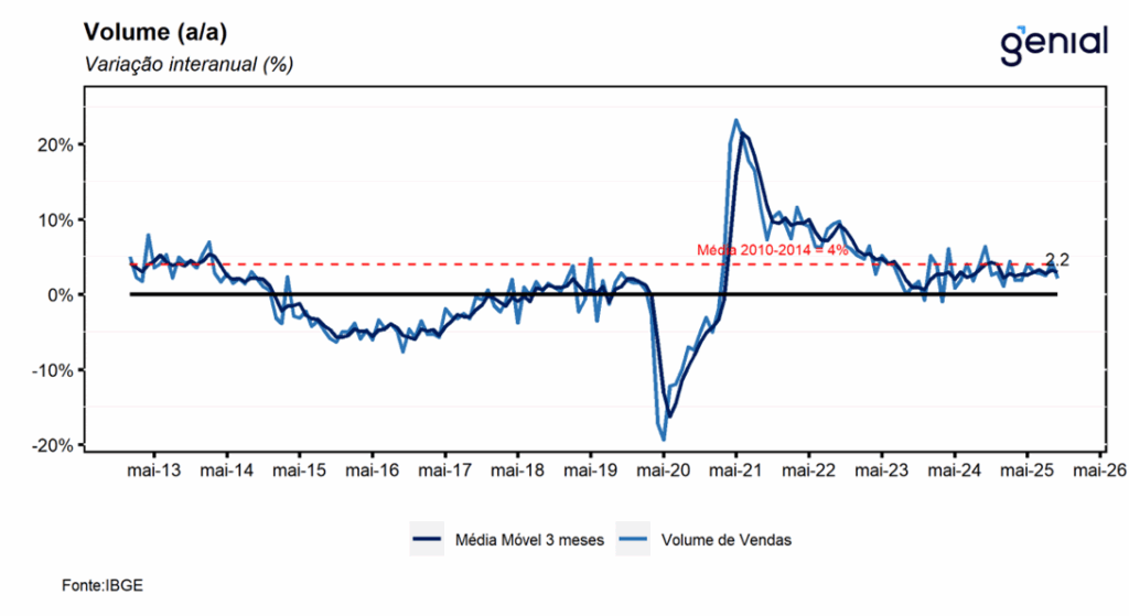 Com o resultado mais recente, a média móvel trimestral do volume de serviços registrou alta de 0,4%, apresentando um desempenho relativamente estável ao longo das últimas oito leituras e reforça a percepção de que o setor segue resiliente, operando em terreno positivo. O dado corrobora a nossa avaliação de que mesmo diante de um ambiente macroeconômico mais desafiador – com inflação ainda elevada, política monetária restritiva e um elevado grau de incerteza -, o setor de serviço deve sustentar um processo gradual de arrefecimento da economia, se beneficiando de um mercado de trabalho ainda aquecido e uma política fiscal expansionista.