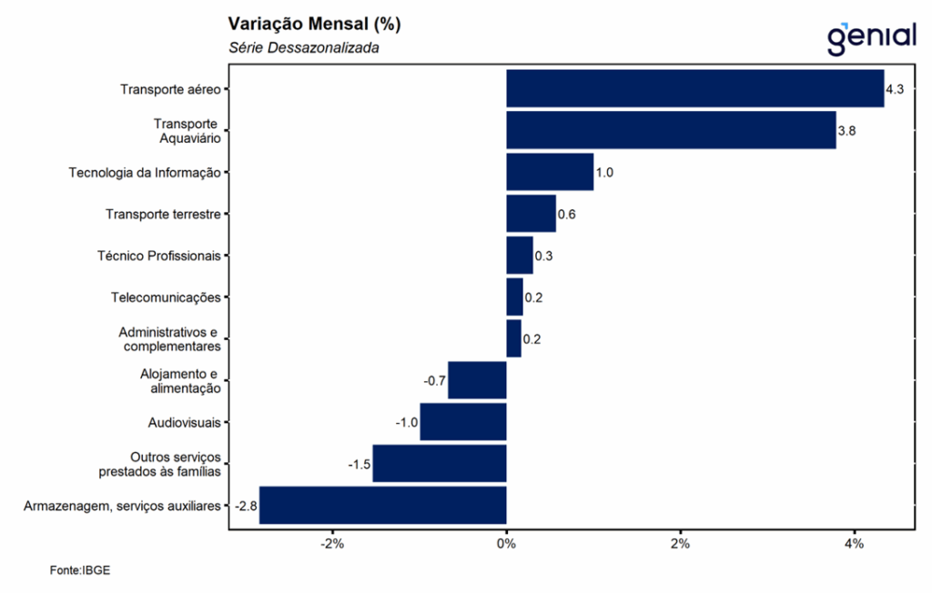 O desempenho no mês foi marcado pela alta de todas as cinco categorias pesquisadas. O principal destaque positivo ficou por conta do segmento de transportes (1,0% m/m), dando continuidade às duas altas observadas nas leituras anteriores, refletindo o escoamento de uma safra bastante positiva de grãos e do avanço do comércio on-line que fez com que a série atingisse o nível mais elevado já registrado em sua série histórica. As demais altas ficaram por conta dos serviços de informação e comunicação (0,3% m/m), renovando o nível mais elevado já registrado na sua série histórica, contudo arrefecendo em relação à alta de 1,2% m/m registrada no mês imediatamente anterior; outros serviços (0,5% m/m), avançando pelo quarto mês consecutivo; profissionais e administrativos (0,1% m/m); e os serviços prestados às famílias (0,1% m/m).