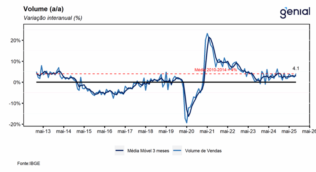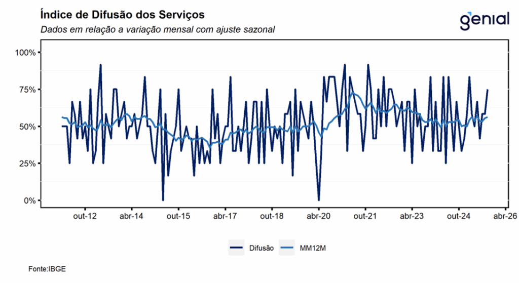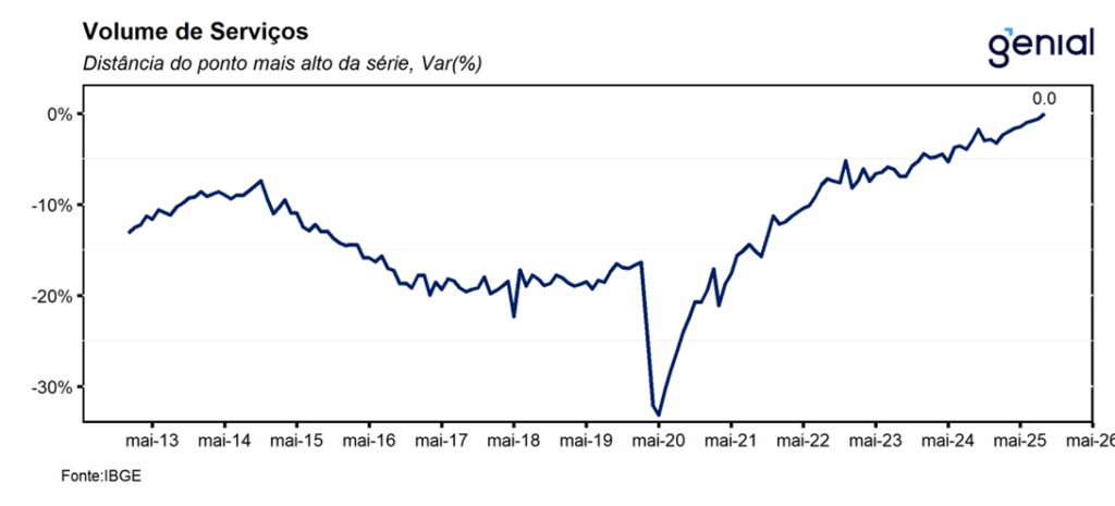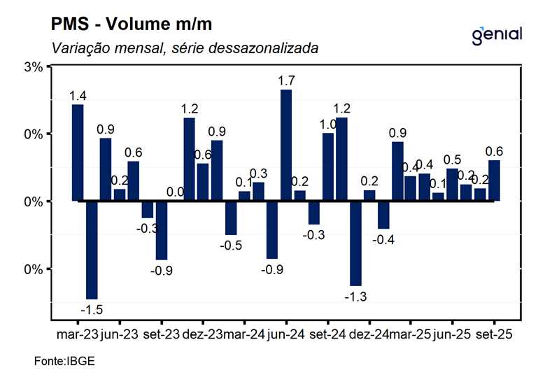 Com o resultado de setembro e as revisões nos meses anteriores, o setor de serviços se encontra 19,5% acima do nível pré-pandemia e opera no nível mais elevado já registrado em sua série histórica. Além disso, cabe destacar que, com o resultado de serviços, o setor de serviços acumula alta de 2,9% no ano e deixa um carrego estatístico de 0,5% para o quarto trimestre e de 2,8% para o ano cheio de 2025.