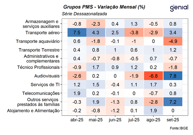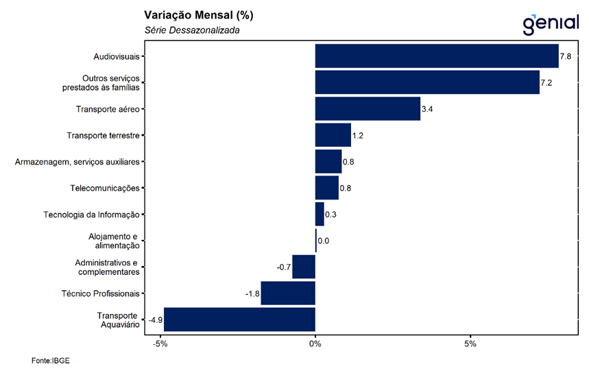 O desempenho no mês foi marcado pela alta de três das cinco grandes categorias pesquisadas. O principal destaque positivo ficou por conta do segmento de transportes (1,2% m/m), dando continuidade à expansão observada no mês anterior (0,2% m/m), refletindo principalmente as altas de 3,4% m/m no transporte aéreo e de 1,2% m/m no transporte terrestre, que foram parcialmente compensados pelo recuo de 4,9% m/m no transporte aquaviário. Além disso, tivemos alta de 1,2% m/m dos serviços de informação e comunicação, retornando para o campo de expansão após o recuo de 0,5% m/m observado em agosto, de modo que, a série se encontra no patamar mais elevado já registrado na série histórica, refletindo a combinação entre a alta de 7,8% m/m dos serviços audiovisuais e agências de notícias e o ligeiro recuo de 0,1% m/m de serviços tecnologia da informação e comunicação. Por fim, a última alta ficou por conta de outros serviços (1,6% m/m), dando continuidade à sequência de duas altas observadas nos meses imediatamente anteriores.