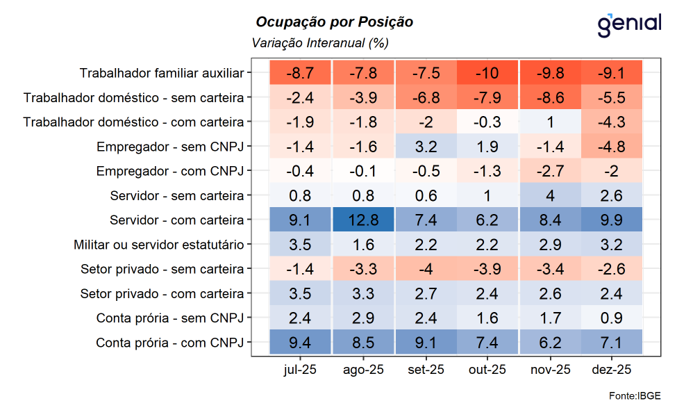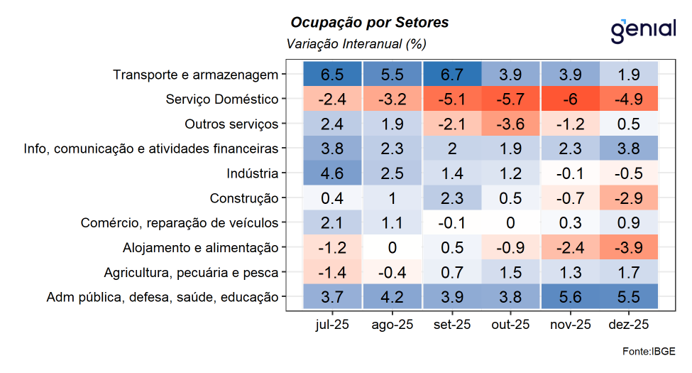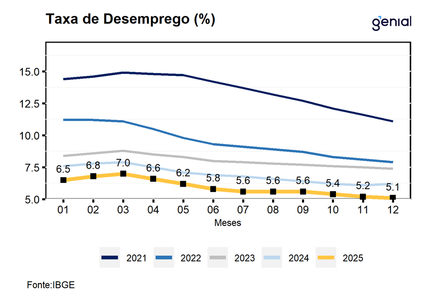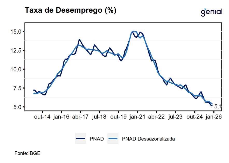 De acordo com o IBGE, a taxa de desemprego registrada no trimestre móvel encerrado em dezembro de 2025 foi de 5,1% da força de trabalho, resultado que venho em linha tanto com o mercado (Broadcast+) quanto da nossa expectativa para o mês, ambas de 5,1%. Com este resultado, a taxa de desemprego dá continuidade ao recuo observado no trimestre móvel imediatamente anterior, com uma queda 1,1 p.p. em relação ao mesmo período do ano anterior, renovando a menor taxa já registrada na série histórica da PNAD. Na série com ajuste sazonal, a taxa de desemprego registrou recuo de 0,14 p.p. saindo de 5,49% para 5,35%, renovando também o menor patamar já registrado em sua série histórica.