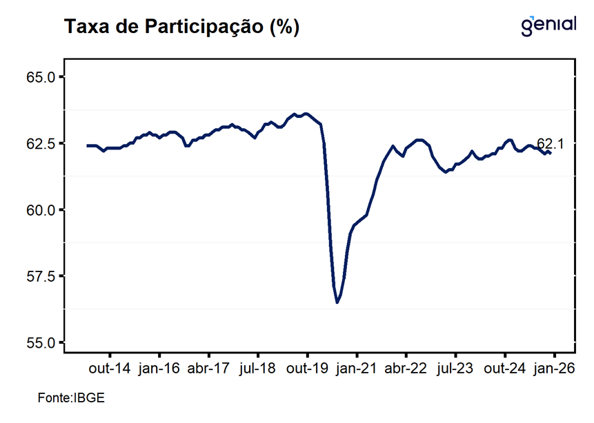 Para o próximo trimestre móvel, preliminarmente, nossos modelos sugerem que a taxa de desemprego se elevará para 5,5% da força de trabalho, refletindo principalmente a sazonalidade desfavorável de início de ano, de modo que, na série com ajuste sazonal, a taxa de desocupação deve sofrer uma alta para 5,47% da força de trabalho. Com os números de hoje, seguimos com a nossa expectativa de que o mercado de trabalho deve sofrer um pequeno ajuste em 2026, fazendo com que a taxa de desemprego média do ano saia de 5,9% da força de trabalho para 6,1%.